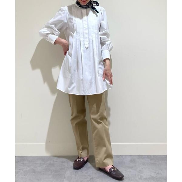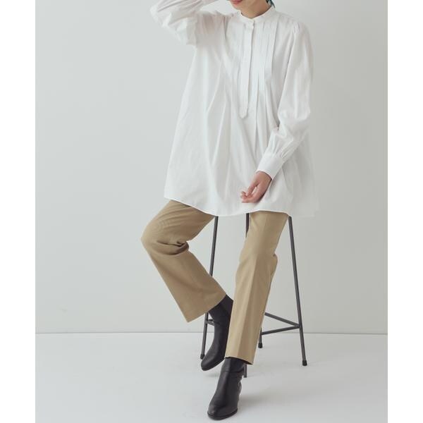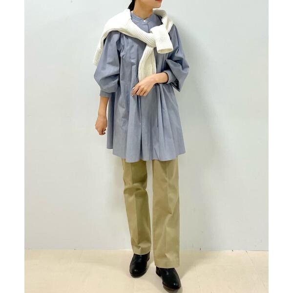 【おすすめコーディネート】短丈トレーナー+ボリュームブラウスとのスタイリングがおすすめです。腰回りをすっきりと仕上げてあるので、ロング丈やボリュームトップスと相性の良いパンツです。