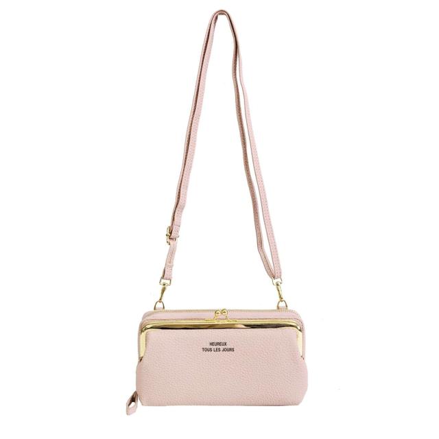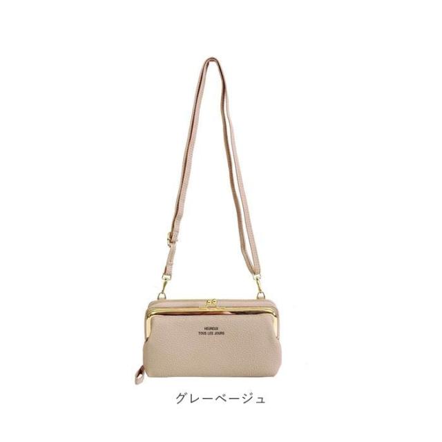 荷物が少ない日のお出かけにぴったり!「横型合皮がま口ショルダー」が発売。ポーチとお財布が一体化した便利なアイテム。シボ感のある合皮素材とゴールドの金具が上品な印象を演出。ポーチは片手で開閉できるがま口タイプ。スマホはもちろん、リップや薄手のハンカチなどの小物が入るサイズ感。(※手帳型、厚みのあるスマホケースを使用している場合は入らない可能性があります。)スナップボタンで取り外し可能。お財布部分はラウンドファスナーで大きく開き、引き手は指を引っかけて開けやすい!内側はファスナー式小銭入れ×1、札入れ×2、カードポケット×4を装備。ショルダーストラップは付け外しや長さ調節が可能。必要最低限の小物をまとめて持ち歩けるから、ライブや旅行時でも活躍!