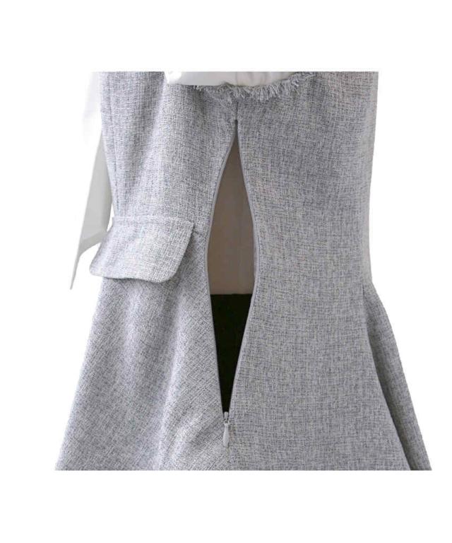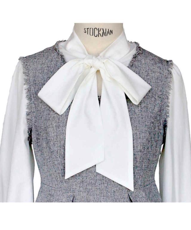 ボウタイブラウスとツイードのジレをレイヤードしたようなドッキングトップス。