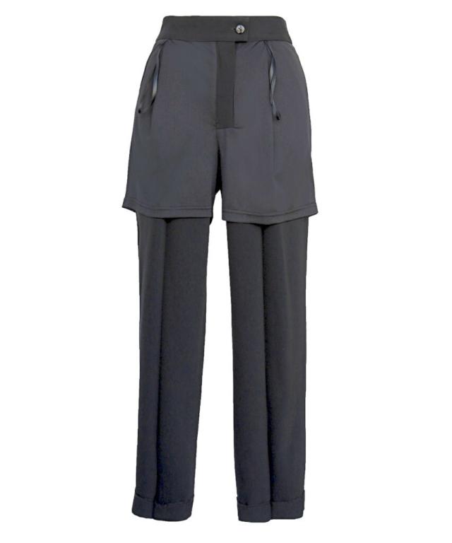 ボウタイブラウスとツイードのジレをレイヤードしたようなドッキングトップスとテーパードパンツのセットアップ。