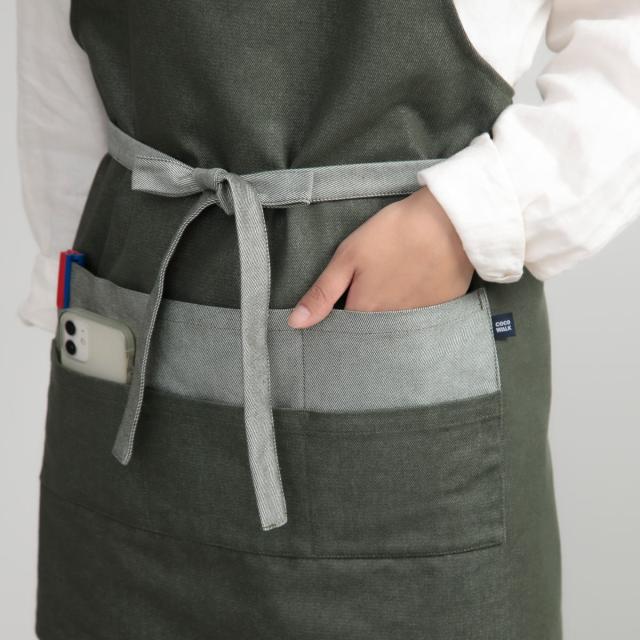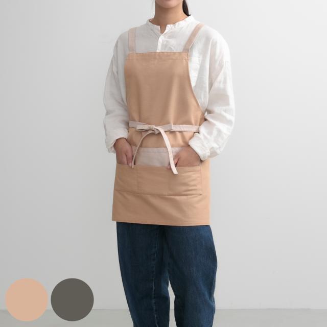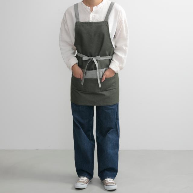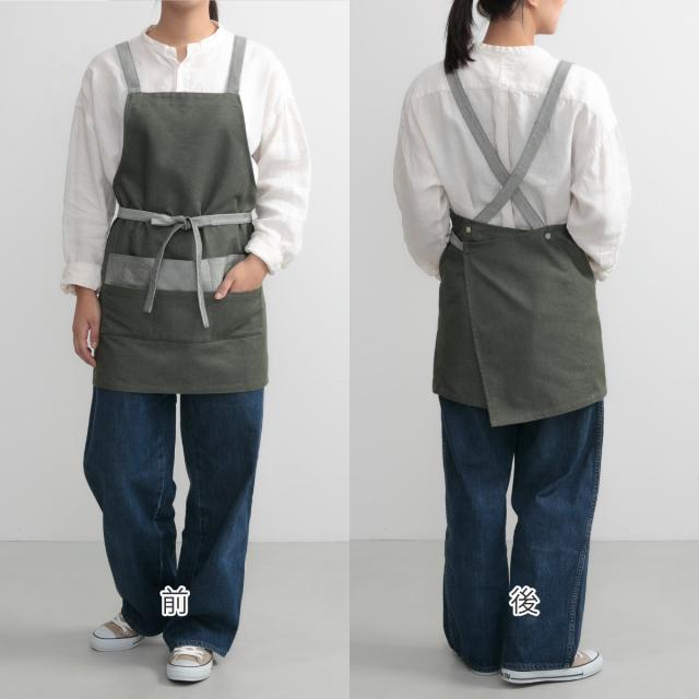 優しいツートンカラーのデザインがおしゃれな、ショート丈ラップエプロンです。ショート丈なので動きやすく、毎日使いに最適。ナチュラルなテイストで生活によく馴染みます。