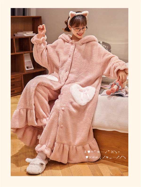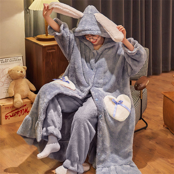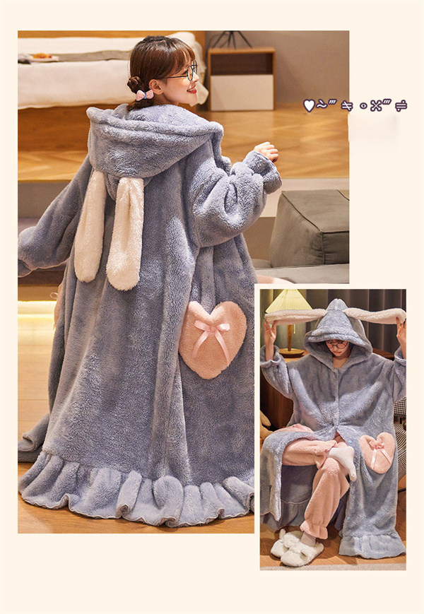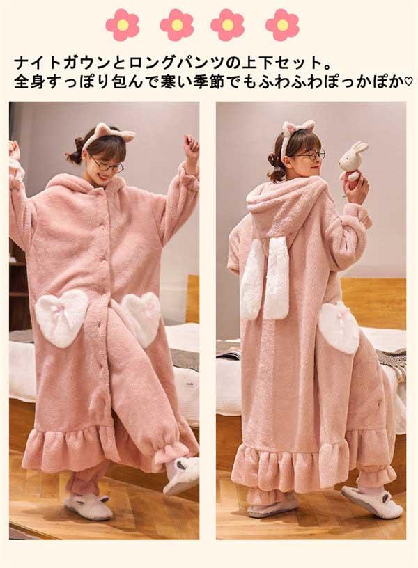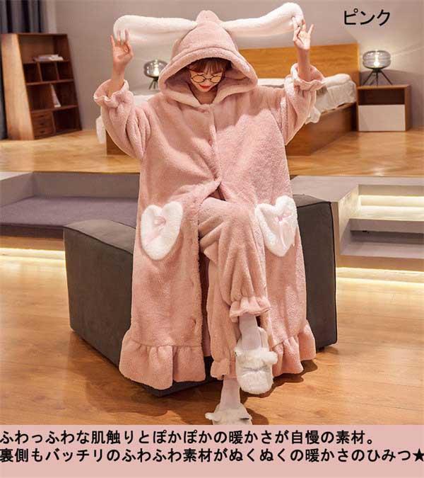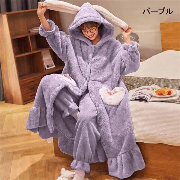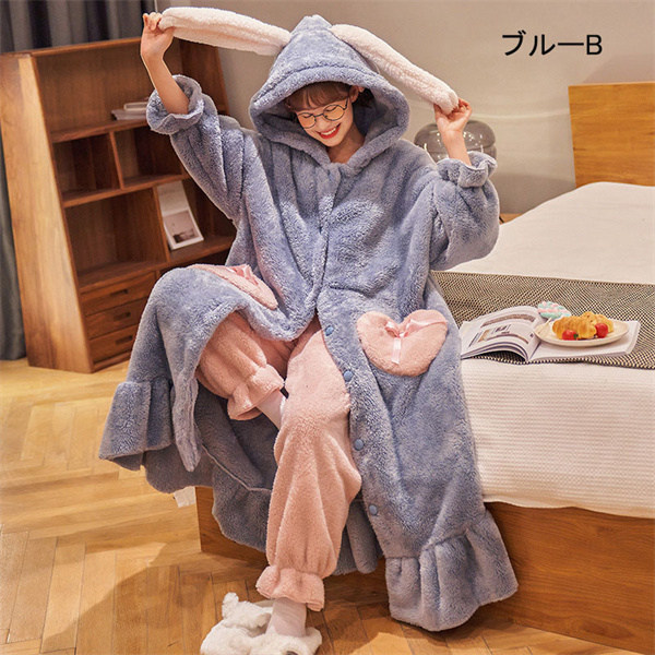 【レビュー投稿で+5%還元】S-3L パジャマ レディース 冬 モコモコ うさぎ耳付き 兎耳 ガウン バスローブ かわいい 長袖 寝巻き 女性用 ふわふわ ふわもこ 前開き 結婚祝い あったか フード付き ブルーB ピンク パープル dh379d3