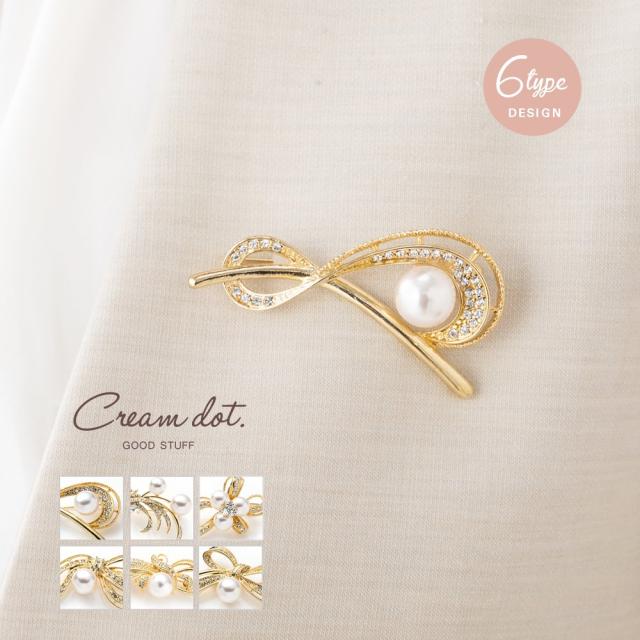 パールやビジューを贅沢に飾ったブローチ。緩やかな曲線が大人っぽい上品デザインでジャケットやドレスに合わせやすいアイテムです。お祝いシーンなど華やかな装いのワンポイント使いにオススメ。