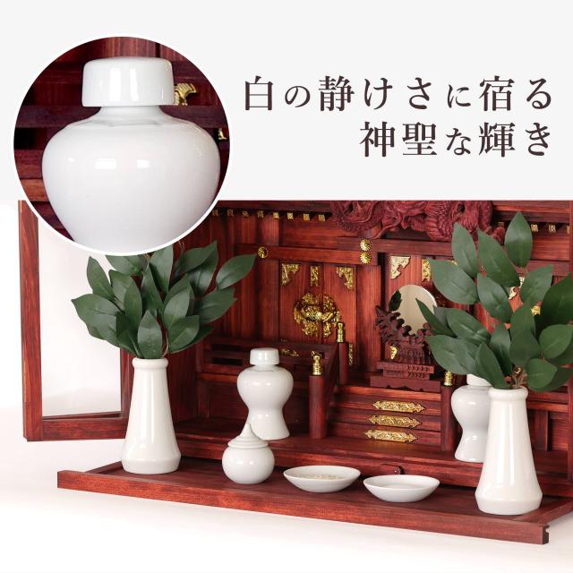 なめらかな質感と光沢、国産「せともの」陶器製の神具7点セット。お祀りに必要な榊立、平次、水玉、皿、増加榊などお供えに必要な一式が揃っています。神鏡は神社と同じ「真鍮本鏡」を彫り込んだ台座に乗せています。