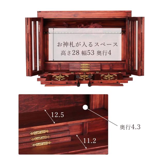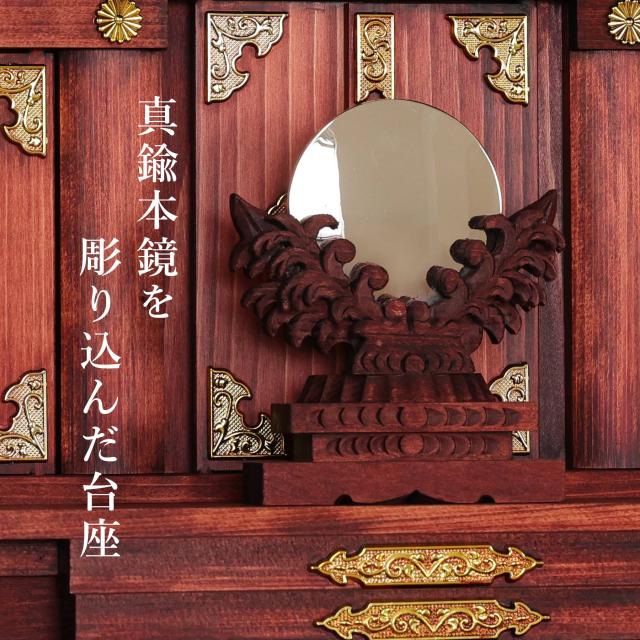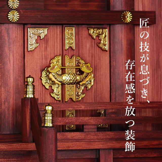 お神札が収めやすい三社宮の形式。大きさは一般のご家庭から店舗、事務所、会社の応接間などに最適、すこし大きめのサイズ感。