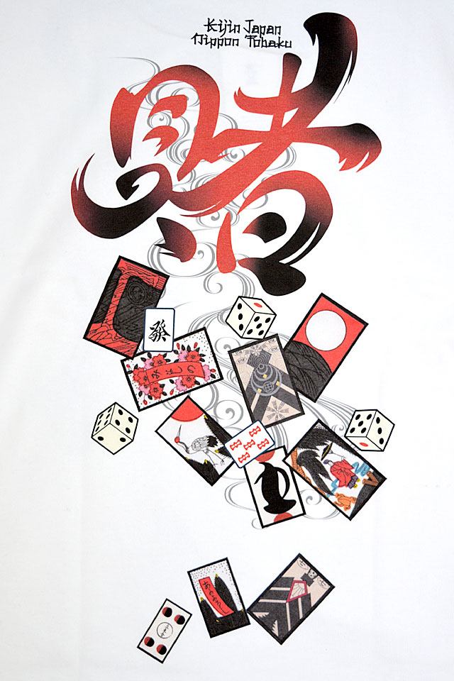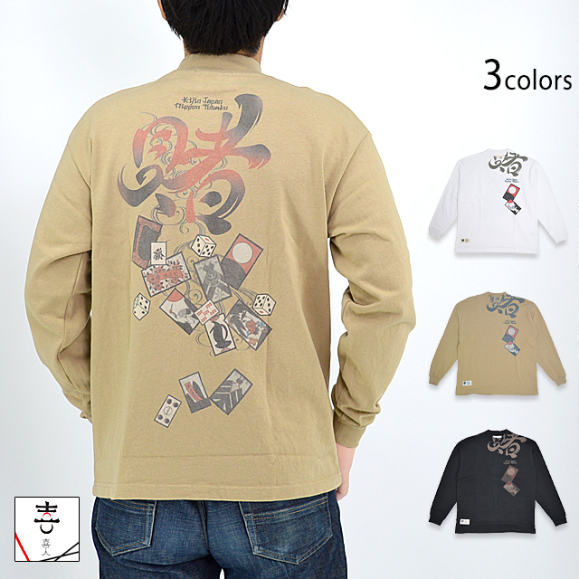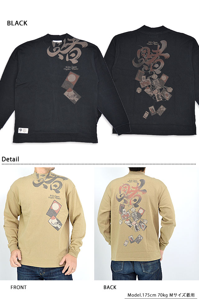 着た人、それを見た人が笑顔になれる、他にはないデザインを提供し続けている「喜人」さんから「賭けヘビーモックネックロングTシャツ(KJ-22102)」のご紹介です。 トレンドのモックネック長袖Tシャツを和でアレンジしました。 日本の賭博をデザインに落とし込みおいちょかぶや花札、サイコロなどが描かれています。 生地は一枚でも十分な防寒性を持った16/2天竺を使用。 | ||||||||||||||||