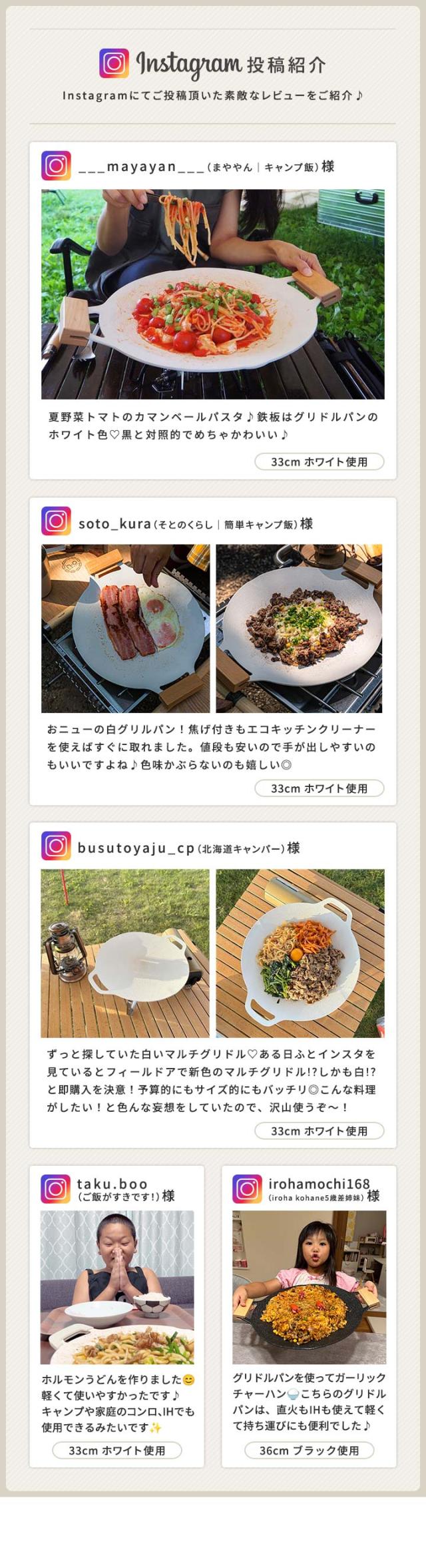 | 特記事項: ※直火・ガス・IH・電気調理器など様々な熱源で使用可能。 ※シーズニングは必要ありません。 ※食洗器には対応しておりません。 ※家庭用カセットコンロでご使用される場合、グリドルパンがカセットコンロ本体を覆ってしまうと輻射熱がガスボンベを発熱させる恐れがありますので、熱したグリドルパンまたはハンドルをガスボンベに触れない、近づけないよう、十分に注意して下さい。 ※収納袋の内側にはPVC(ポリ塩化ビニール)コーティングを施しています。PVC(ポリ塩化ビニール)コーティングには臭いが有り、開封直後は人によって過敏に感じやすい場合もございます。どうしても気になる場合などは、屋外など直射日光の当たらない風通しの良い場所で、1〜2日程度吊るしていただくと臭いが軽減します。 |