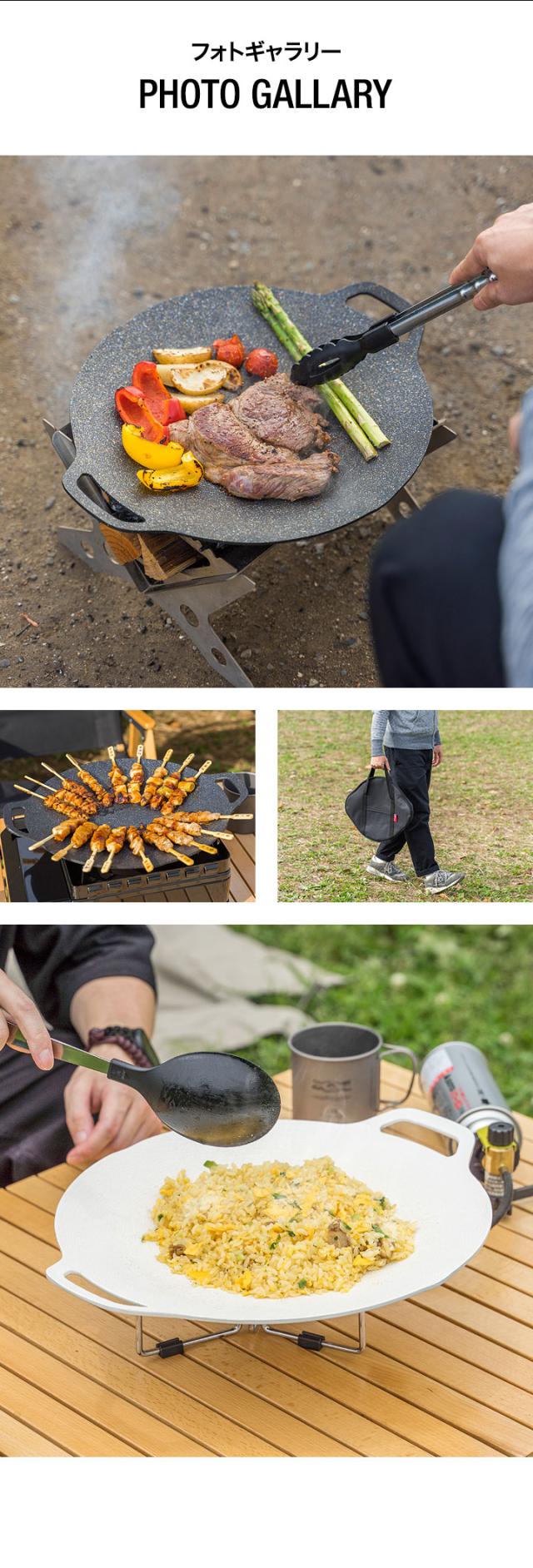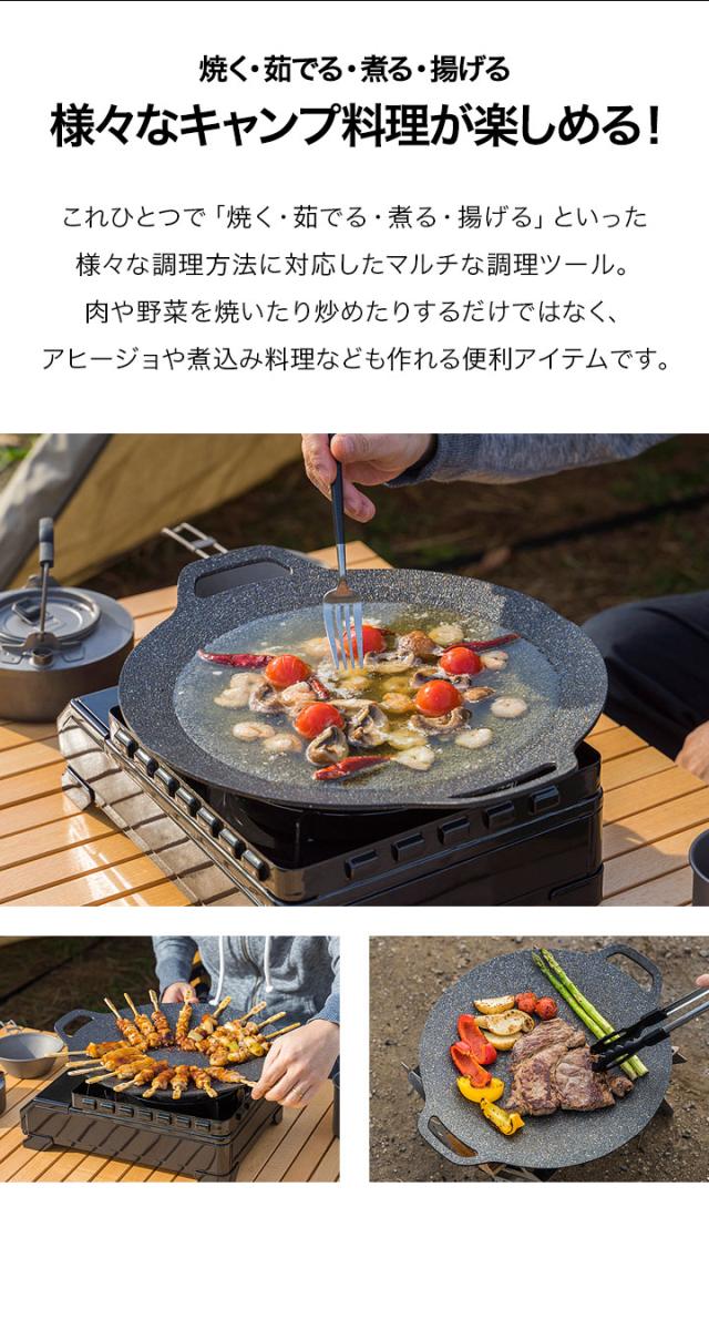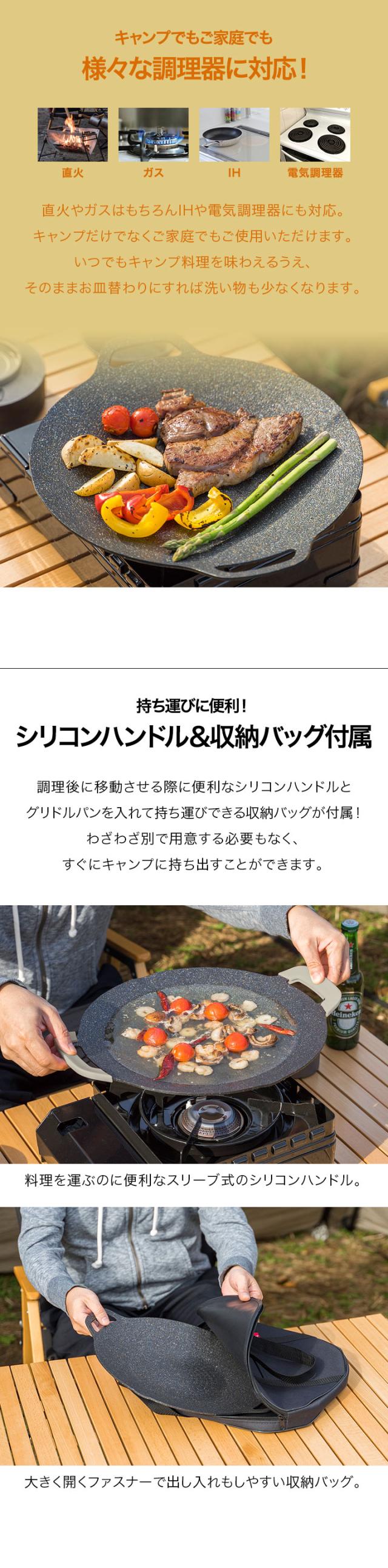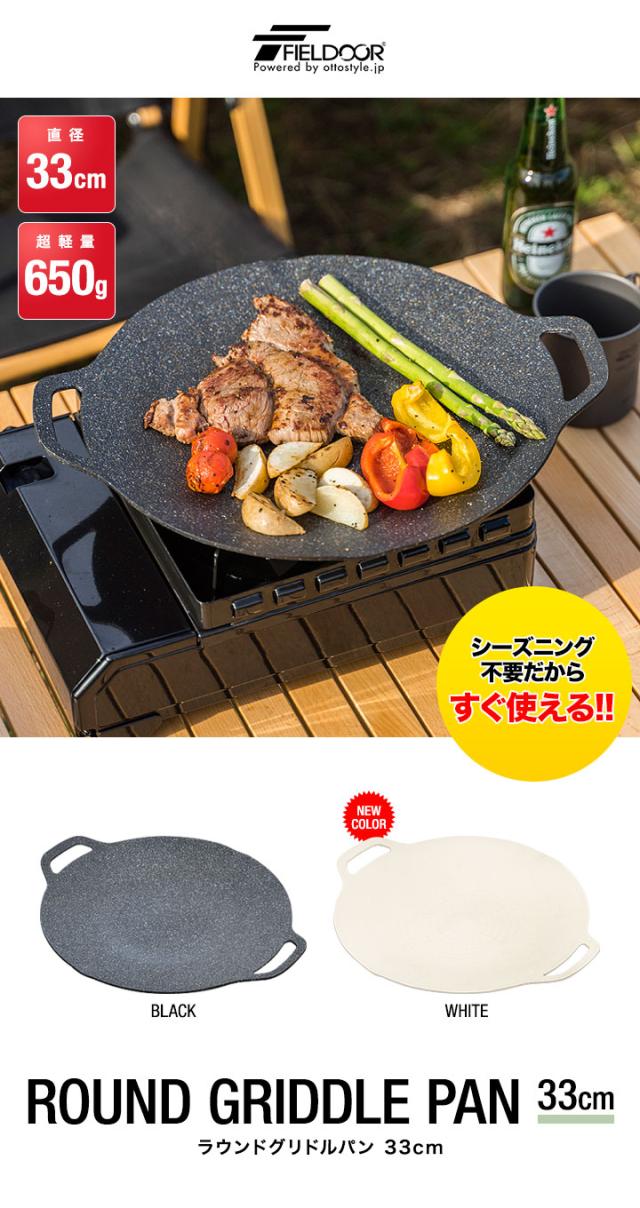 FIELDOOR ラウンドグリドルパン Mサイズ 丸型 33cm×39cm 直火/ガス/IH対応 軽量アルミ合金 グリルパン グリルプレート マルチグリドルパン フライパン アウトドア キャンプ キャンプ飯 シリコンハンドル・バッグ付き 1年保証 送料無料