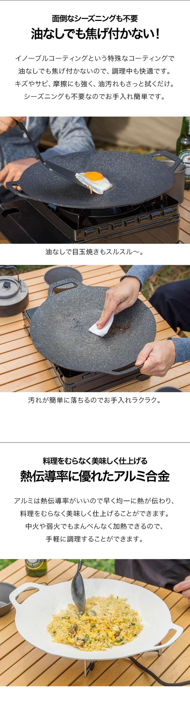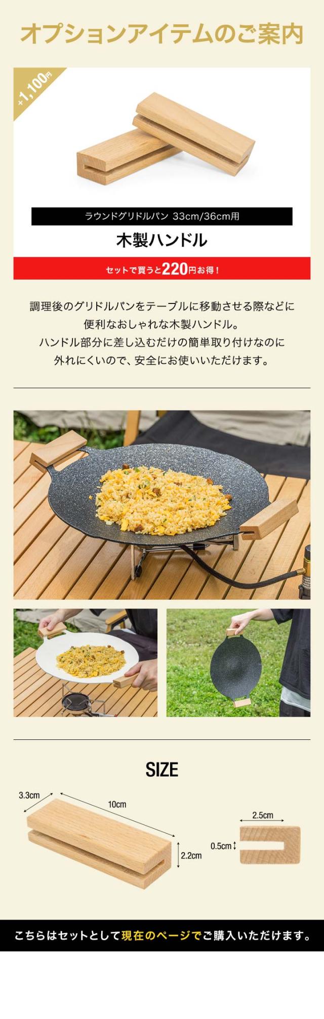 | 特記事項: ※本製品はFIELDOOR製ラウンドグリドルパン33cm/36cmに取り付け可能です。 ※ラウンドグリドルパン29cmに取り付けると外れやすく危険なので、ご使用はお控えください。 ※調理中は本製品を外してください。 |
