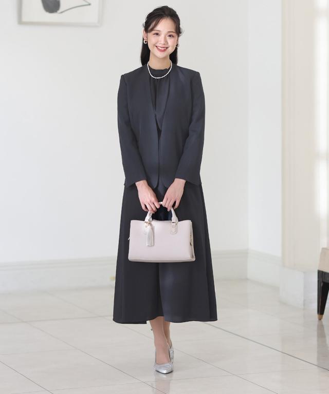 ノーカラージャケットとロングワンピースの2点セット。<br>