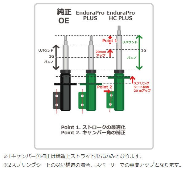 EnduraPro HC PLUSは、EnduraPro PLUSのスペックを継承しつつ、20?oの車高アップを実現した純正形状ダンパーです。