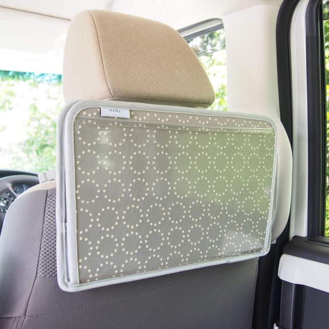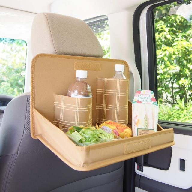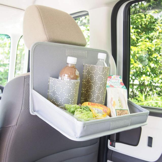 ナチュラルカラーと北欧風デザインがおしゃれな折りたたみ式の食事用トレイです。ヘッドレストに取り付けるだけで、後部座席に簡易テーブルを設置できます。ペットボトル等の飲み物やサンドイッチ、おにぎりなどを置くことができ、長時間のドライブや渋滞も快適に過ごせます。
