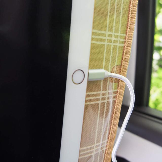 透明ポケットにはタブレットの充電コードを通す穴が左右の2ヶ所にあるので、タブレットを使用しながら充電できます。