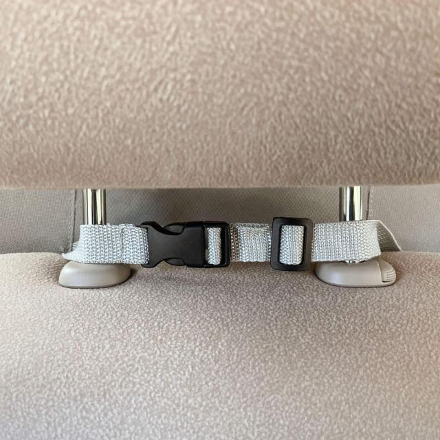 ヘッドレストを引き上げ、ポール部分にベルトをくぐらせ取り付けます。バックルを留めて、ベルトで長さ調節するだけで簡単に設置できます。