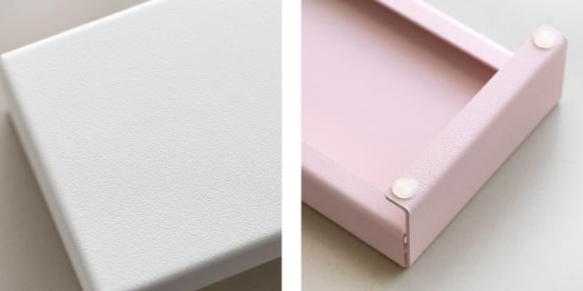 表面はエポキシ樹脂粉体塗装が施されており、ざらりとしたマットな質感となっております。落ち着いた雰囲気で、どんなキッチンにも馴染みます。また、キッチンカウンターのキズ防止・すべり止め用の保護クッションが付属しています。(※お客様自身で取付けて頂きます)