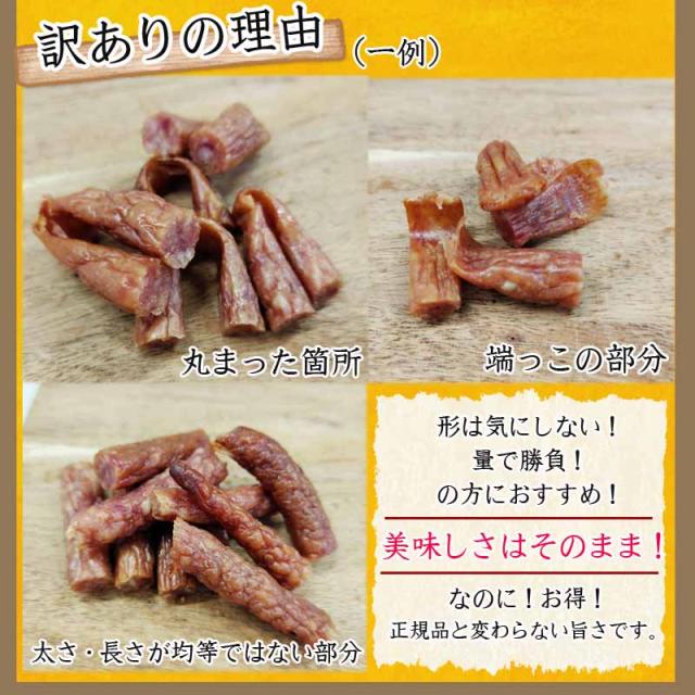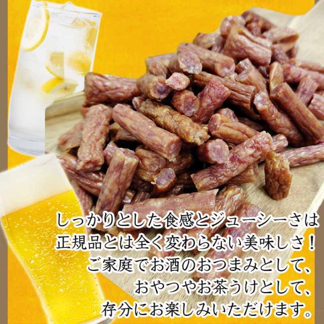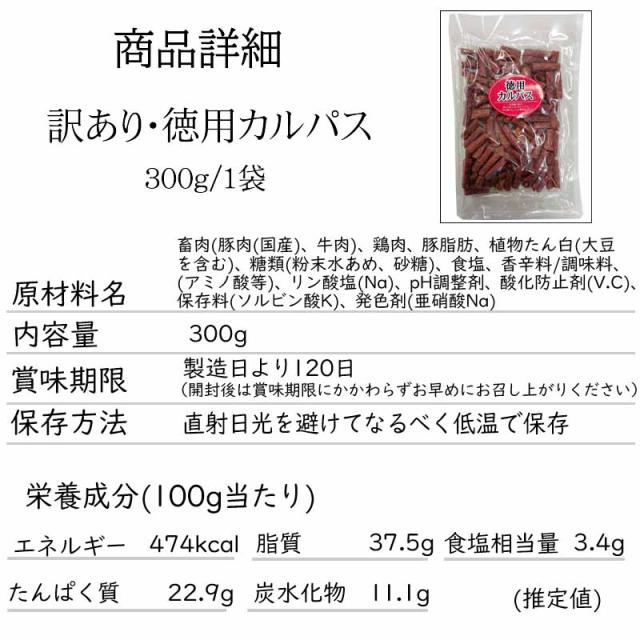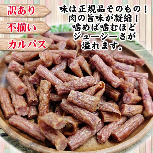 天然腸に詰めて直火で仕上げたカルパスの訳あり商品です。製造の過程で出てくる端っこや丸みがある部分、太さが均等ではないものなど含めて1袋にたっぷり300g入ってます。無選別のため、いろいろな形のものが入ってますが、味は本来と変わりません。しっかりとした食感とジューシーさは正規品と全く変わらない美味しさ!