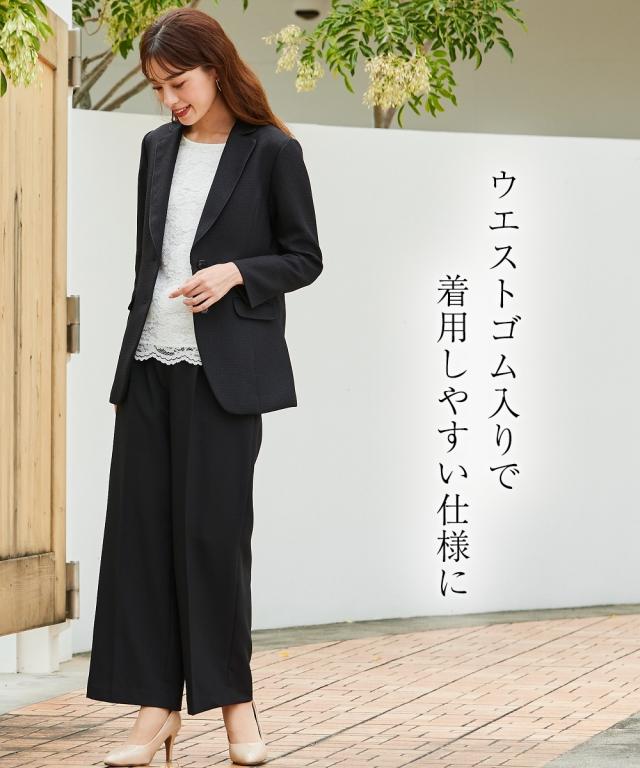 上品なツイード調ロング丈ジャケットでハレの日を彩るパンツスーツです。上品な印象を格上げしてくれるツイード調ジャケットはロング丈で綺麗に体型をカバー。繊細なレースを使用したブラウスにパンツスタイルで、スタイリッシュな着こなしに。パンツはウエストゴム入りで着用しやすい仕様です。