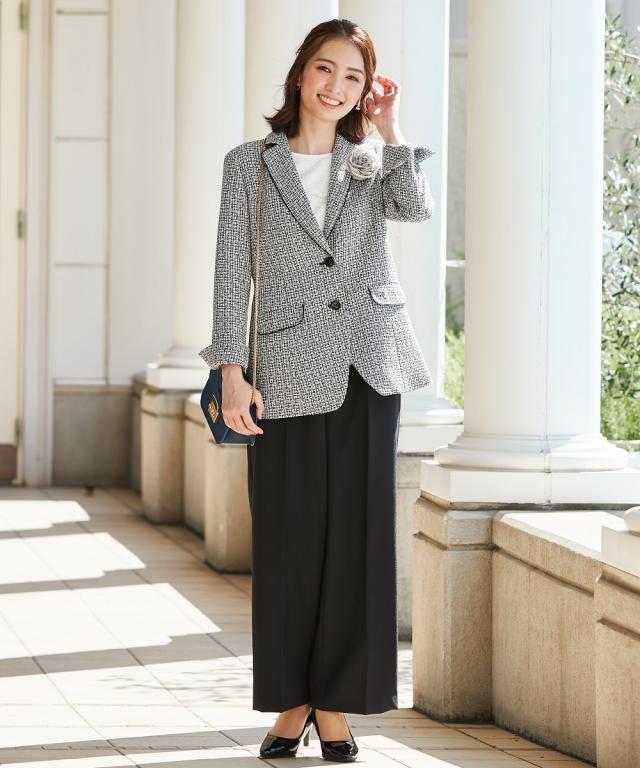 【入学式・卒業式・フォーマル】ツイード調ロング丈ジャケットアンサンブル(テーラードジャケット+レースブラウス+パンツ)