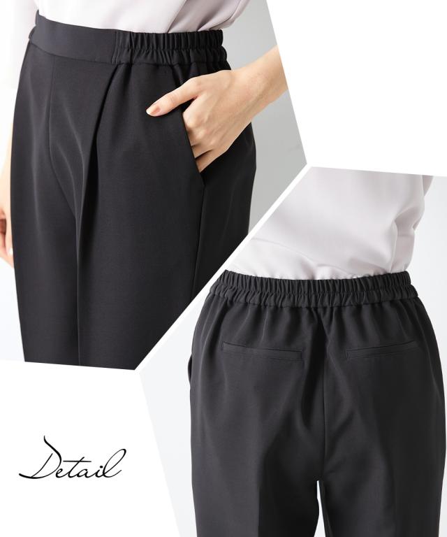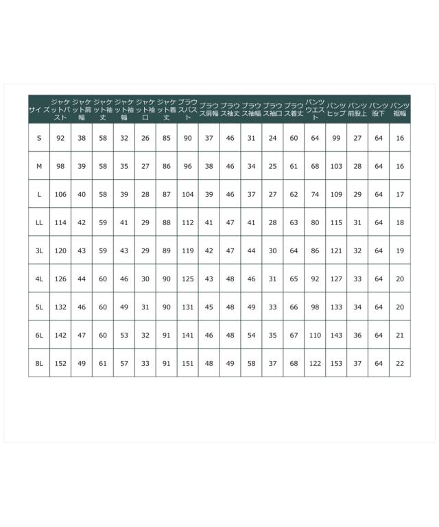 品質=[表地]<ジャケット>ポリエステル93%・ポリウレタン7% <ブラウス>ポリエステル93%・ポリウレタン7% <パンツ>ポリエステル93%・ポリウレタン7%【裏地】有(ジャケット:総裏 ブラウス・パンツ:無) ジャケット:前マグネットボタン開 ポケット前2 ブラウス:後涙ボタン開 パンツ:ファスナー無 ウエスト脇・後ゴム入 ポケット両脇共布ベルト付 ※この商品は3点同サイズのみで販売します。※ベルトは取り外しできます。 原産国:中国製(企画デザインは日本) 洗濯表示:ドライクリーニング
