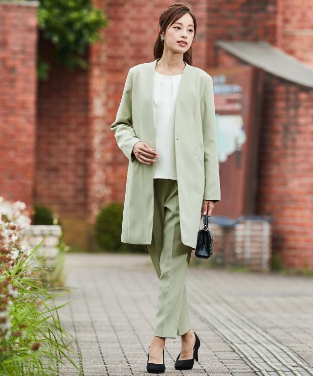 スーツ パンツ フォーマル レディース 入学式 卒業式 Callarus ロング ジャケット テーパード 3点セット ロング丈 +タック ブラウス + ベルト 有 グリーン+オフ+グリーン/黒+ピンクベージュ+黒 LL/3L ニッセン nissen