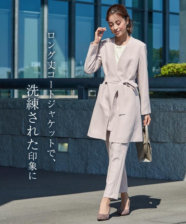 縛られたカタチではなく、「想い」が人と人をつなぐシーンにもテイストにも年齢にも縛られない自由な着こなしを実現する新しいセレモニーフォーマル。 こだわりポイントエレガンスな装いでクールなママを表現それぞれ着回しできる使いやすい3点セットスーツ抜け感のあるロング丈ノーカラージャケット立体感を演出してくれるタックボウタイ風デザインブラウススタイリッシュなシルエットのテーパードパンツ共布ベルトでウエストマークスタイルが完成セレモニーシーンだけでなく、通勤・結婚式・参観日・七五三・普段使いなど幅広いシーンに対応でき