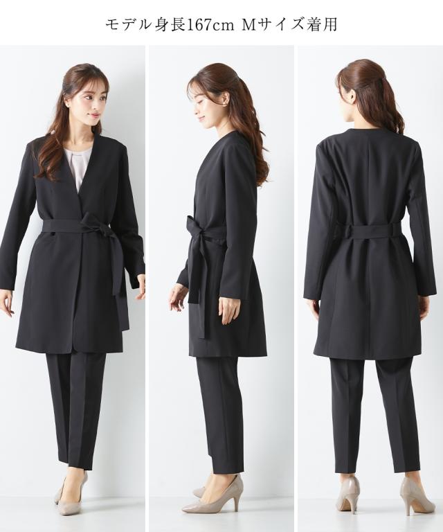 品質=[表地]<ジャケット>ポリエステル93%・ポリウレタン7% <ブラウス>ポリエステル93%・ポリウレタン7% <パンツ>ポリエステル93%・ポリウレタン7%【裏地】有(ジャケット:総裏 ブラウス・パンツ:無) ジャケット:前マグネットボタン開 ポケット前2 ブラウス:後涙ボタン開 パンツ:ファスナー無 ウエスト脇・後ゴム入 ポケット両脇共布ベルト付 ※この商品は3点同サイズのみで販売します。※ベルトは取り外しできます。 原産国:中国製(企画デザインは日本) 洗濯表示:ドライクリーニング