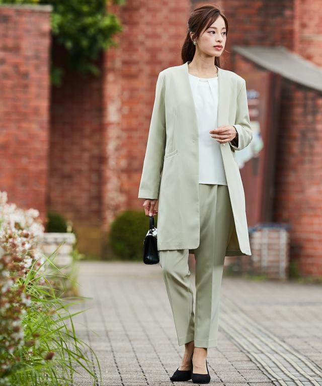 スーツ パンツ フォーマル 大きいサイズ レディース 入学式 卒業式 Callarus ロング ジャケット テーパード 3点セット ロング丈 +タック ブラウス + ベルト 有 グリーン+オフ+グリーン/黒+ピンクベージュ+黒 8L ニッセン nissen