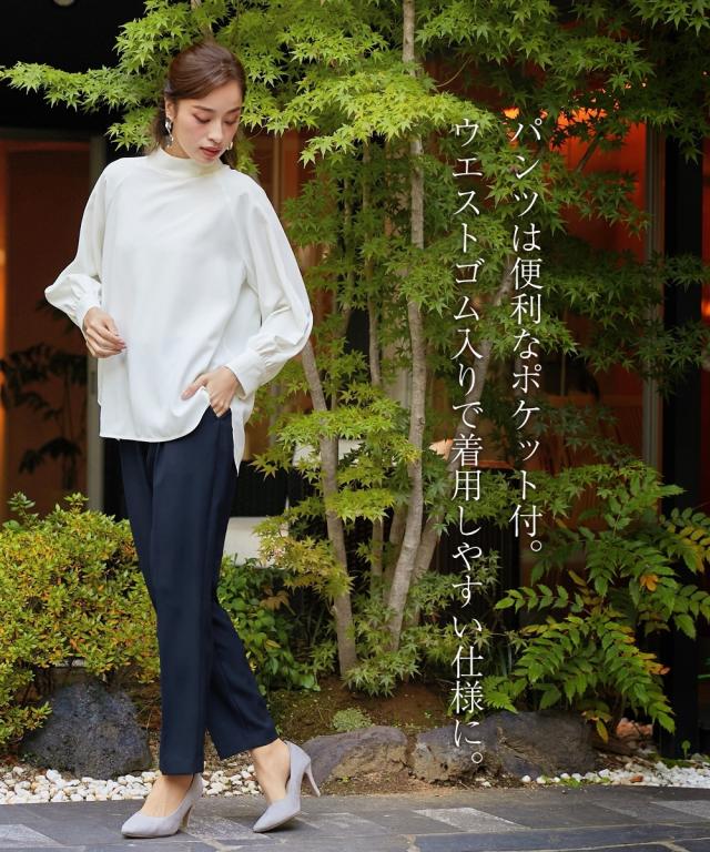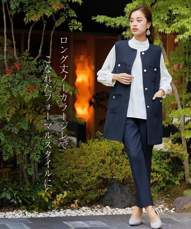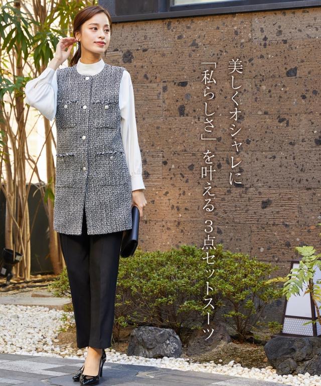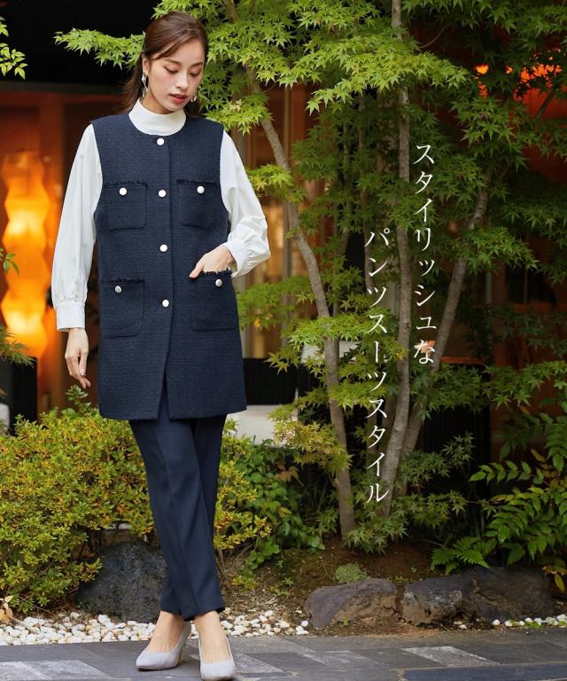 縛られたカタチではなく、「想い」が人と人をつなぐシーンにもテイストにも年齢にも縛られない自由な着こなしを実現する新しいセレモニーフォーマル。 こだわりポイントエレガンスな装いでクールなママを表現それぞれ着回しできる使いやすい3点セットパンツスーツロングジレスタイルで、新しいセレモニースタイルを提案表面感のツイード調生地で上品な装いにポケット部分のフリンジ加工で大人可愛い雰囲気を表現美しく体型をカバーしてくれるスタンドカラーブラウススタイリッシュなシルエットのテーパードパンツ洗濯機で洗えるのでお手入れ簡単忙