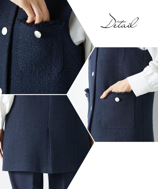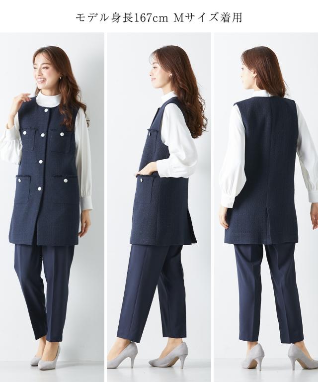 スーツ パンツ フォーマル レディース 入学式 卒業式 Callarus ツイード調 ロング ジレ 3点セット ジレ+ ブラウス + 有 ネイビー+オフ+ネイビー/白黒+オフ+黒 S/M/L ニッセン nissen