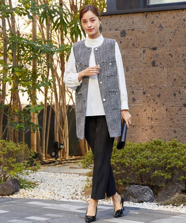 【入学式・卒業式・フォーマル】<Callarus>ツイード調ロングジレパンツスーツ3点セット(ロングジレ+ブラウス+パンツ)
