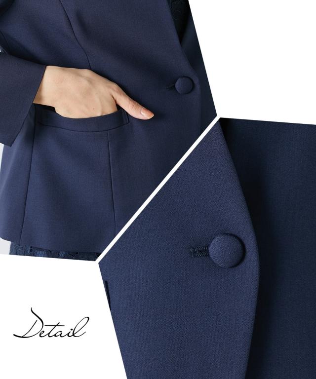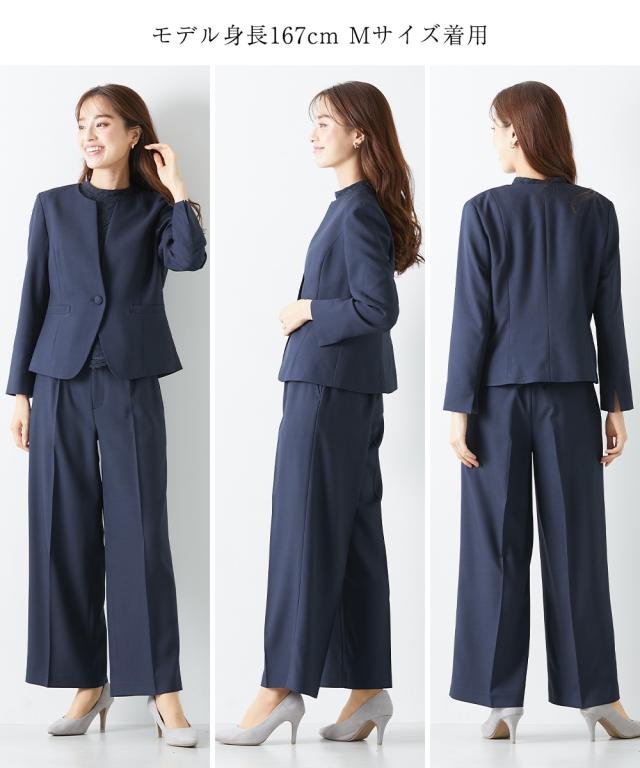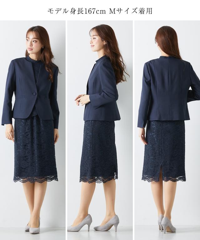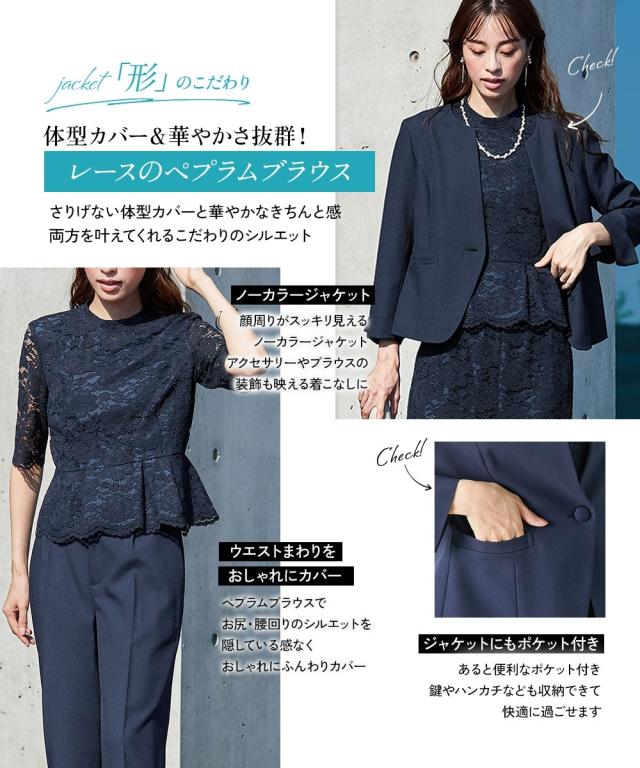 品質=[表地]ジャケット・パンツ:ポリエステル97%・ポリウレタン3%(織物) ブラウス・スカート:レーヨン50%・ナイロン45%・その他5%[裏地]有(ジャケット・スカート:総裏 ブラウス:身頃部 パンツ:無) ジャケット:肩パッド無 前ボタン開 ポケット前2 袖口スリット ブラウス:後ホック付ファスナー開 パンツ:前ファスナー内ホック開 ウエスト後ゴム入 ポケット両脇 スカート:後ホック付ファスナー開 ウエスト総ゴム入 後スリット ※この商品は4点同サイズのみで販売します。 ※レース柄が多少異なる場合