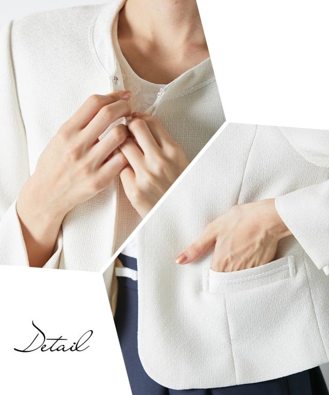 品質=[表地]ポリエステル100%[別布A]ポリエステル100%[別布B]ポリエステル100%【裏地】有(ジャケット:総裏 ワンピース:身頃部 )テーラードジャケット:肩パッド無・前ボタン開・ポケット前2・袖口スリット ノーカラージャケット:肩パッド無・前ホック開・ポケット前2・袖口スリット ワンピース:ウエスト後ゴム入・後ホック付ファスナー開 ポケット両脇 ※この商品は3点同サイズのみで販売します。 ※レース柄が多少異なる場合があります。 原産国:中国製(企画デザインは日本) 洗濯表示:洗濯機OK ネッ