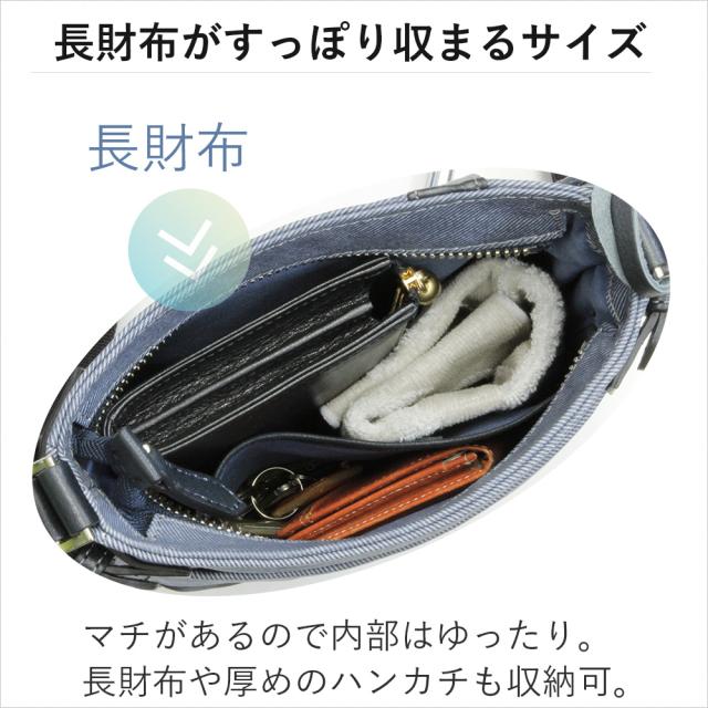 長財布がすっぽりと入るサイズ、マチがあるのでゆったりと必要最低限のアイテムが収まる大きさです。