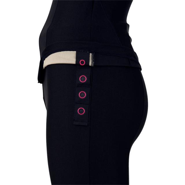 サイドについたカラースナップがトップスとボトムスを繋ぎ止めてくれるため、