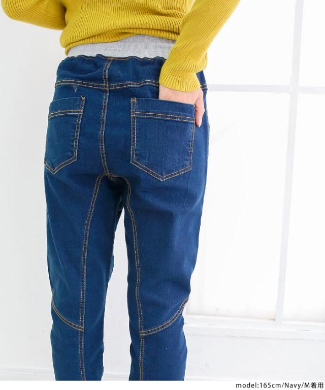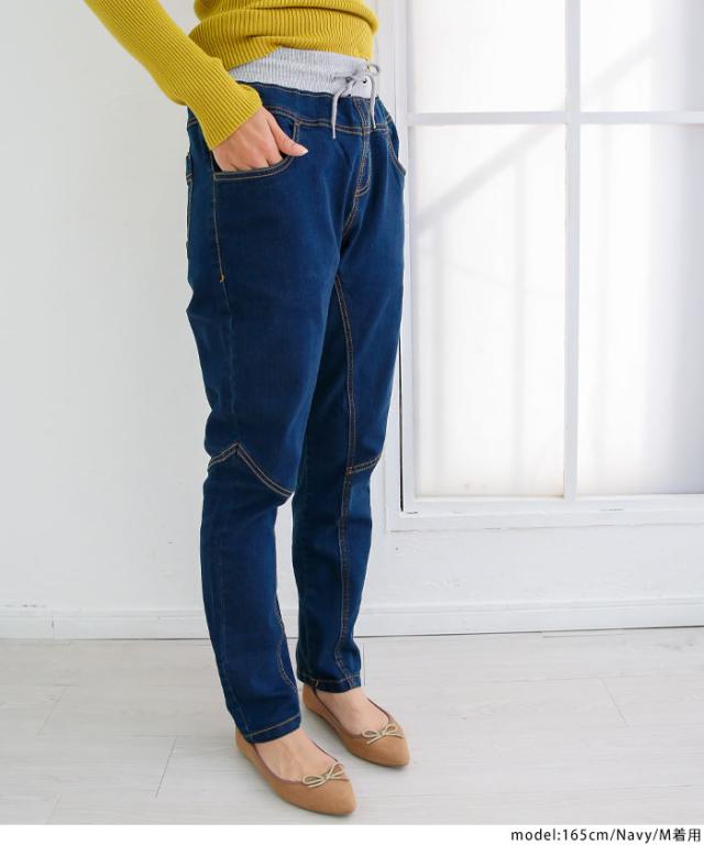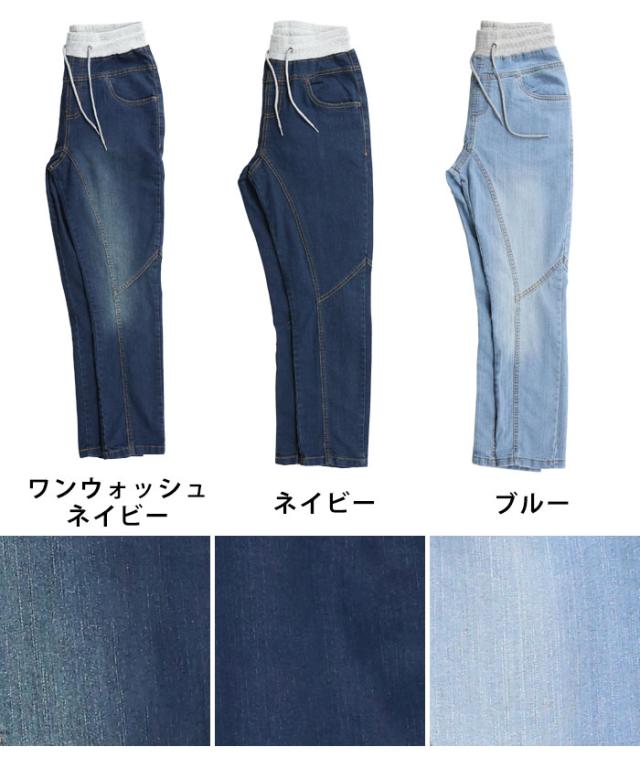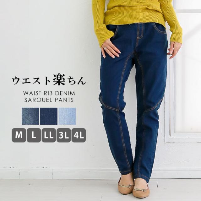 秋新作 大きいサイズ レディース ウエストリブデニムサルエルパンツ レディース 大きいサイズ M L LL 3L 4L ネイビー ブルー
