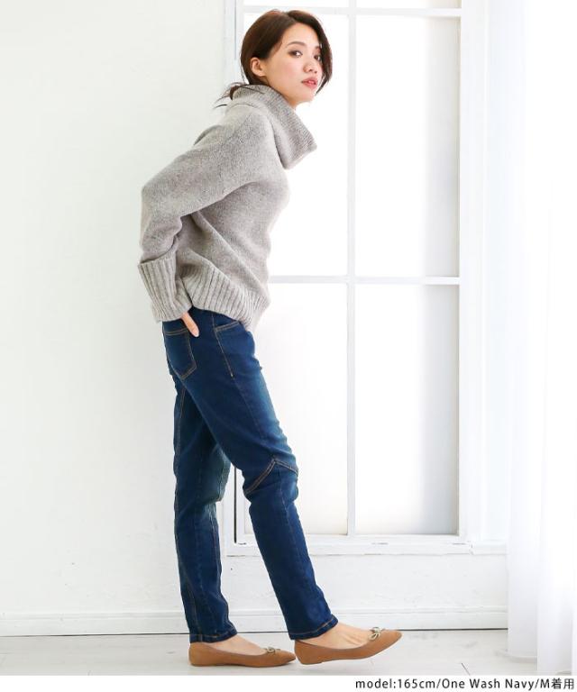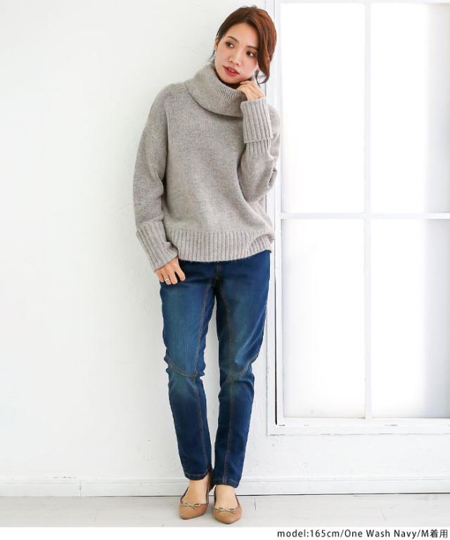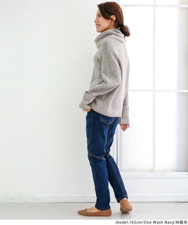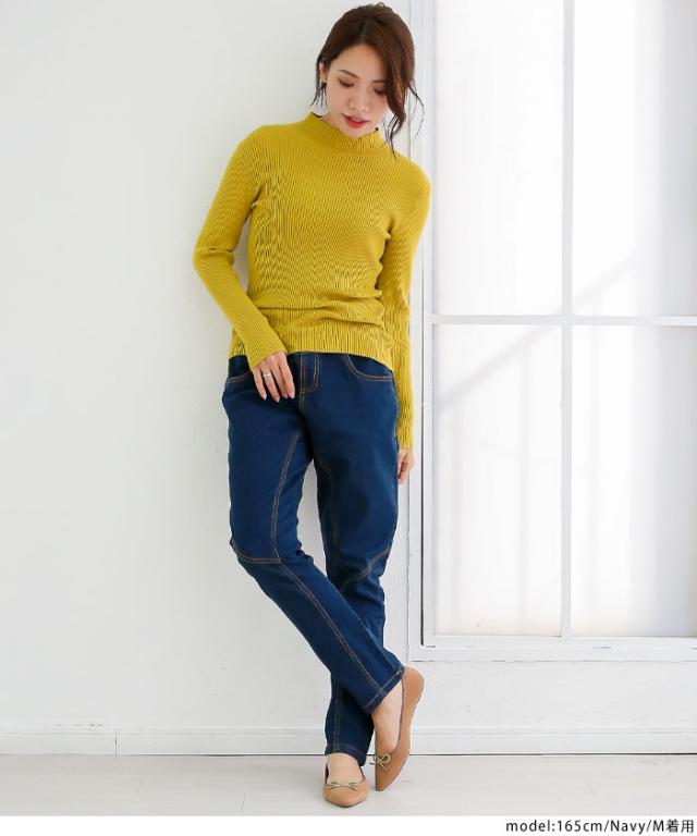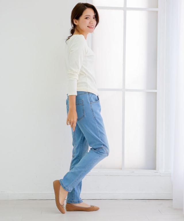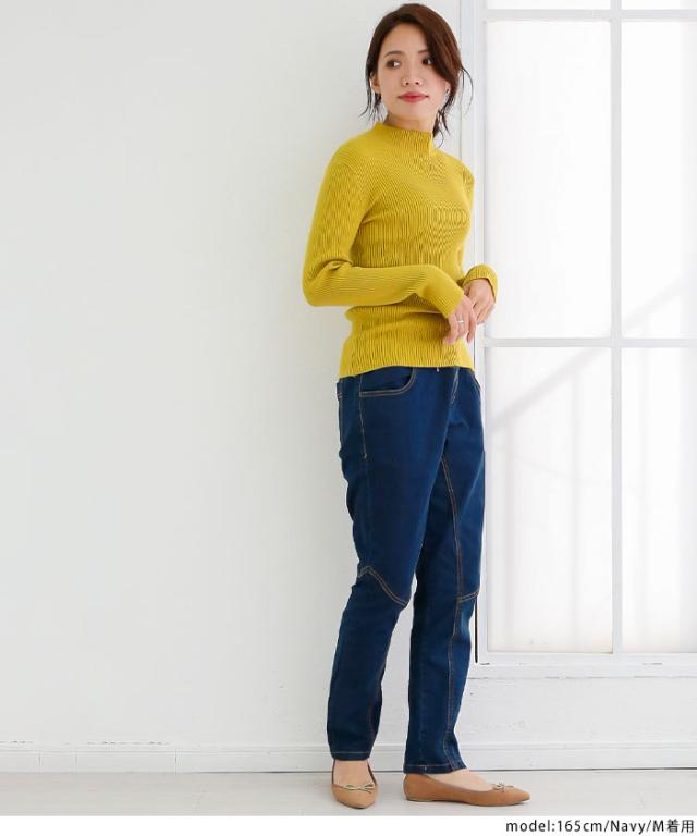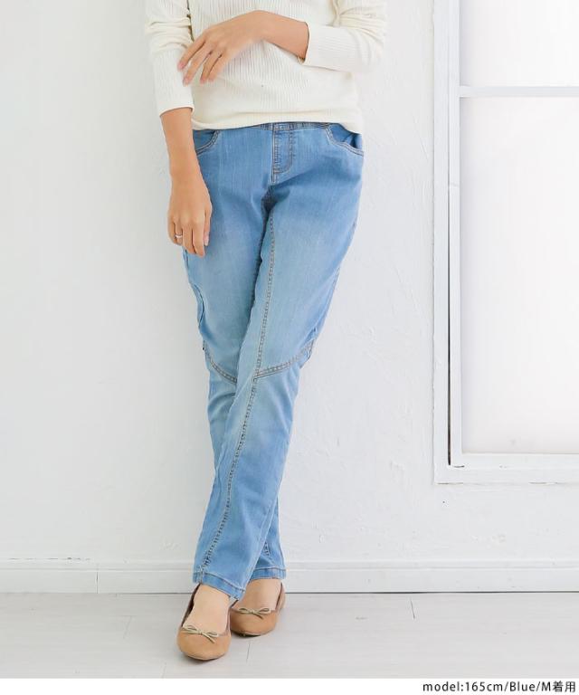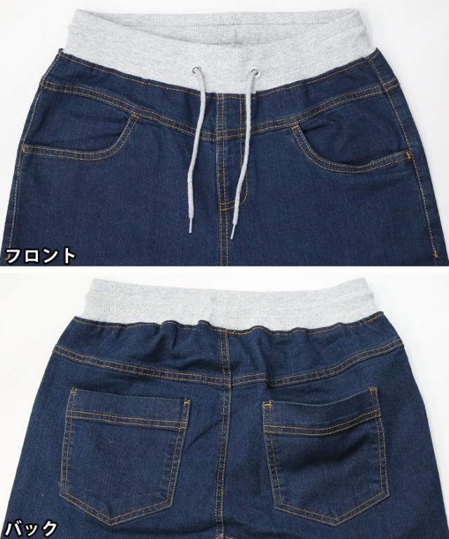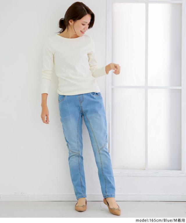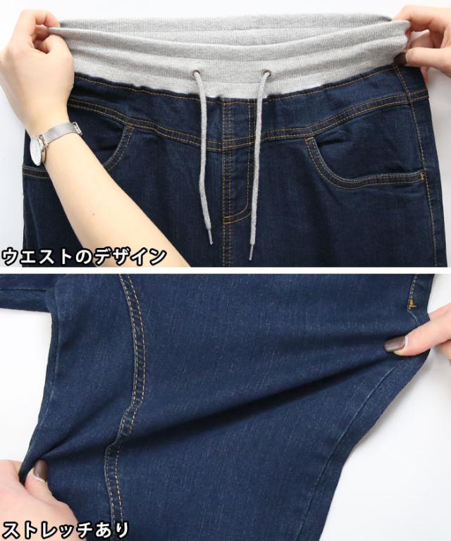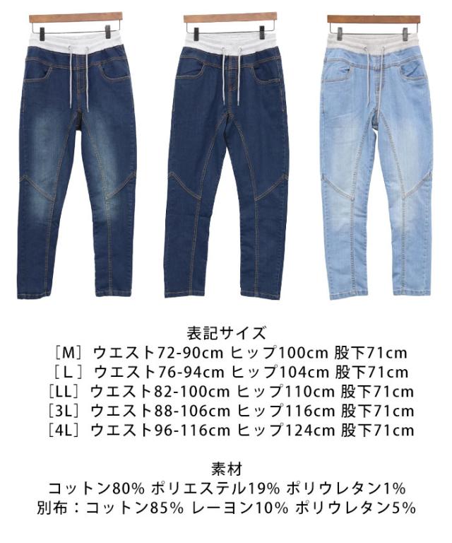 [LLサイズ]ウエスト:41cm、ウエスト伸ばし:50cm、ヒップ:55cm、わたり幅:33.5cm、裾幅:19cm、前股上:34.5cm、後ろ股上:44.5cm、股下:71cm[3Lサイズ]ウエスト:44cm、ウエスト伸ばし:53cm、ヒップ:58cm、わたり幅:35cm、裾幅:20cm、前股上:36cm、後ろ股上:46cm、股下:71cm[4Lサイズ]ウエスト:48cm、ウエスト伸ばし:57cm、ヒップ:62cm、わたり幅:36.5cm、裾幅:21cm、前股上:37.5cm、後ろ股上:47.5cm、股下:71cmストレッチデニム:コットン80%、ポリエステル19%、ポリウレタン1% │ リブ:コットン85%、レーヨン10%、ポリウレタン5%伸縮性:ストレッチあり