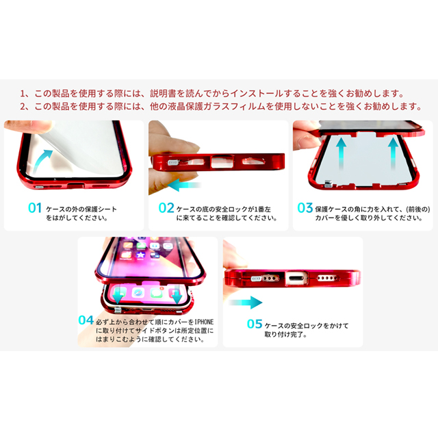 【カメラレンズ保護】 従来には無いカメラ保護用メタル枠プレートが付いておりますのでスマートフォンを落としてしまっても、カメラレンズを守ってくれます。 カメラレンズ部分も覆われている仕様になります。 【手触り感の良いデザイン】 世界で人気のデザイン360°全面カバーをするタイプになります。 内蔵磁石のメタルバンパー+前面ガラスプレート+背面ガラスプレート+カメラ保護カバーとなります。 フレーム磁石による、両面パーツをしっかりと吸着されています。 【安全なスライド式バンパーロック機能】 バンパー下部部分にスライド式ロック機能がございます。 液晶画面側から見て左スライドでロック解除、右スライドでバンパーロックになります。 バンパーロック時には万が一落下してもケースが外れず端末本体を守るケースとなります。 【背面マグネットリング】 取付式マグネットリングが付属しております。 Magsafe充電に対応しております。 (必要のない方は取付無くても上記商品に対応しませんが、製品自体は問題なくご使用いただけます。) 【Qi充電ワイヤレス充電にも対応】 Qi充電ワイヤレス充電にも対応しておりますので、お気軽にご使用いただけます。 ※商品ページ画像は撮影時の照明・影の関係やお使いのモニター環境によって、 若干実物とは色が異なって見える場合もございますのでご理解ください。 【※ご使用前にご確認ください。】 装着の際には必ず上から合わせて順にカバーをiPhoneに装着をお願い致します。 画面には保護ガラスフィルム等を貼らないでください。 ガラスフィルムが二重になり、操作反応が低下します。 本製品は傷や汚れ防止のため、シートが貼ってあります。 保護シールを必ずはがしてからご使用ください。 【パッケージ内容&安心保証・24H以内カスタマーサポート】 当商品に関しまして、商品の引渡日から1ヶ月間の保証期間を設けております。 ご注意:日本国内のみ利用できます。海外は利用できません。 弊社は1ヶ月保証期間と長期間のカスタマーサポート(24時間以内対応)をご提供いたします。 万が一お手元に届いた商品に何らかの初期不良、不備等があった場合、またはご不明な点がございましたら、お気軽にご連絡ください。 |