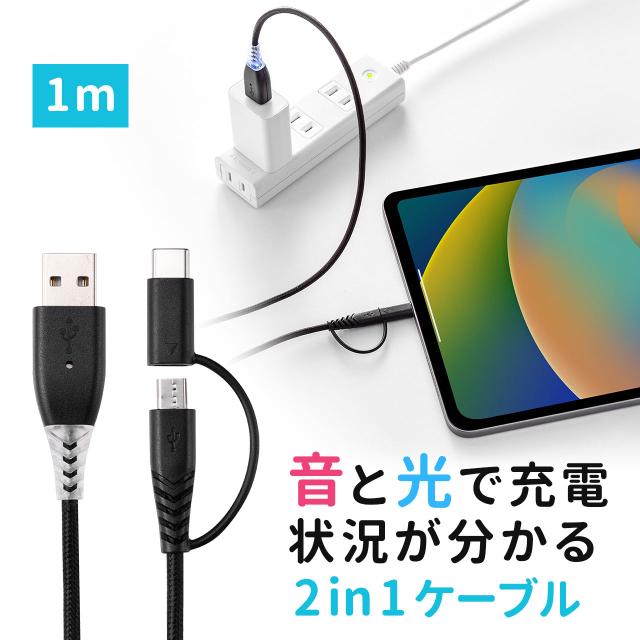 充電お知らせケーブル 2in1 USB Type-Cケーブル 音 光 USB2.0 1m 充電 データ転送 スマホ タブレット ブラック[500-USB069]