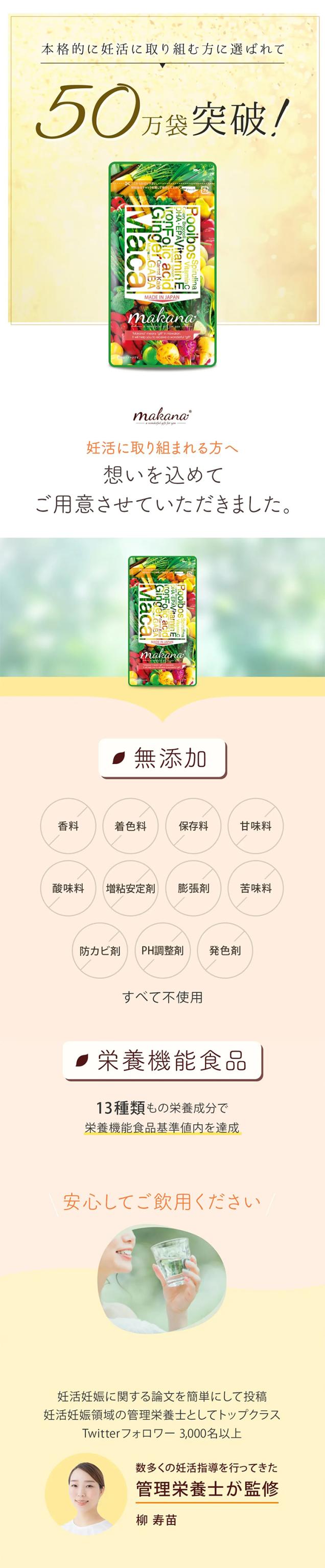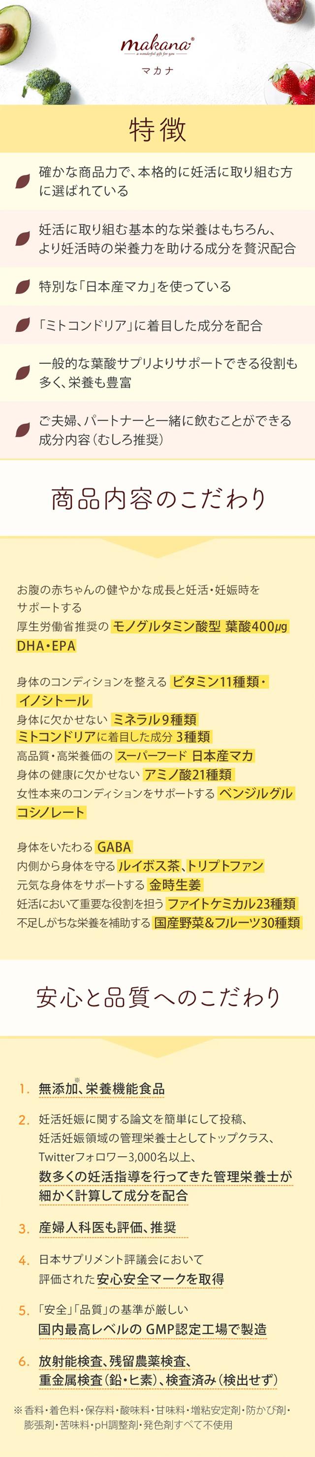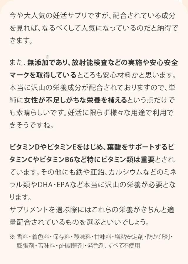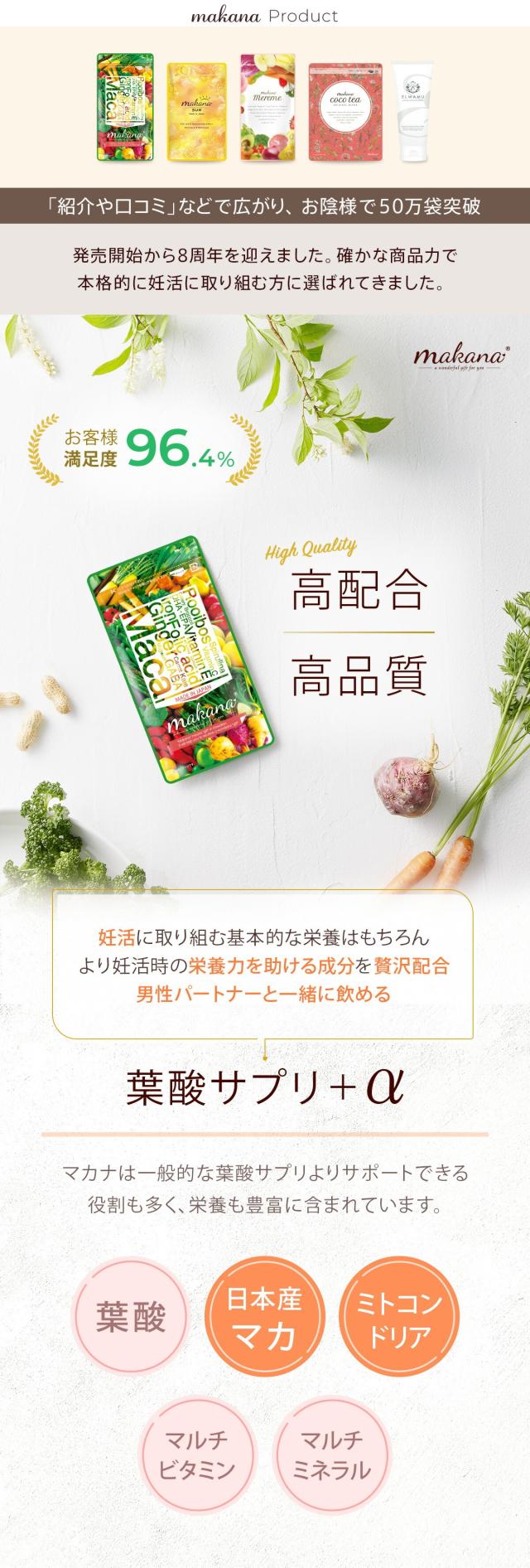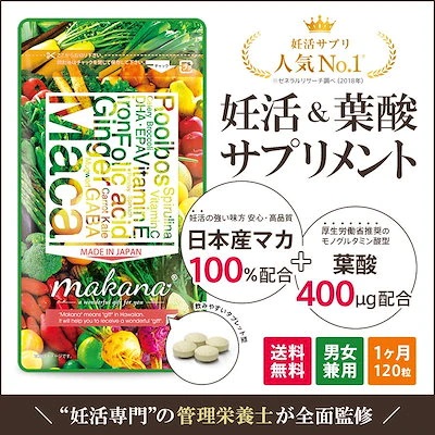 - 無添加、国産マカ等、安心できる要素が多いのがうれしいです。葉酸だけではなく他にもたくさんの栄養を手軽にとれることに感謝です。