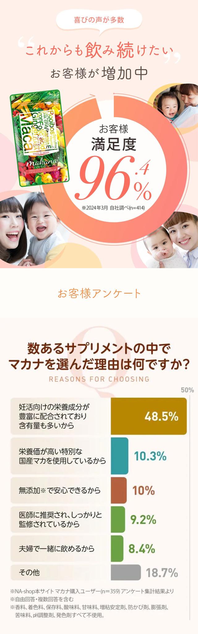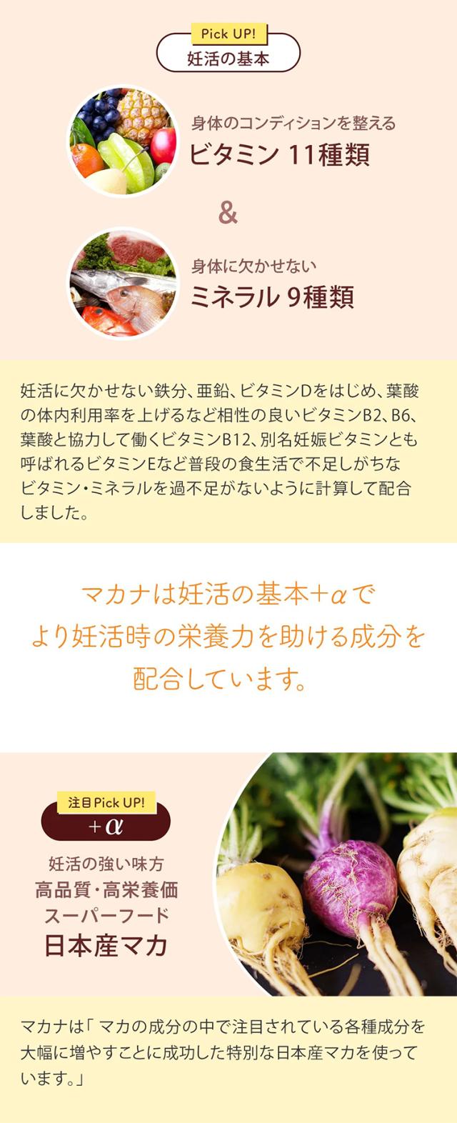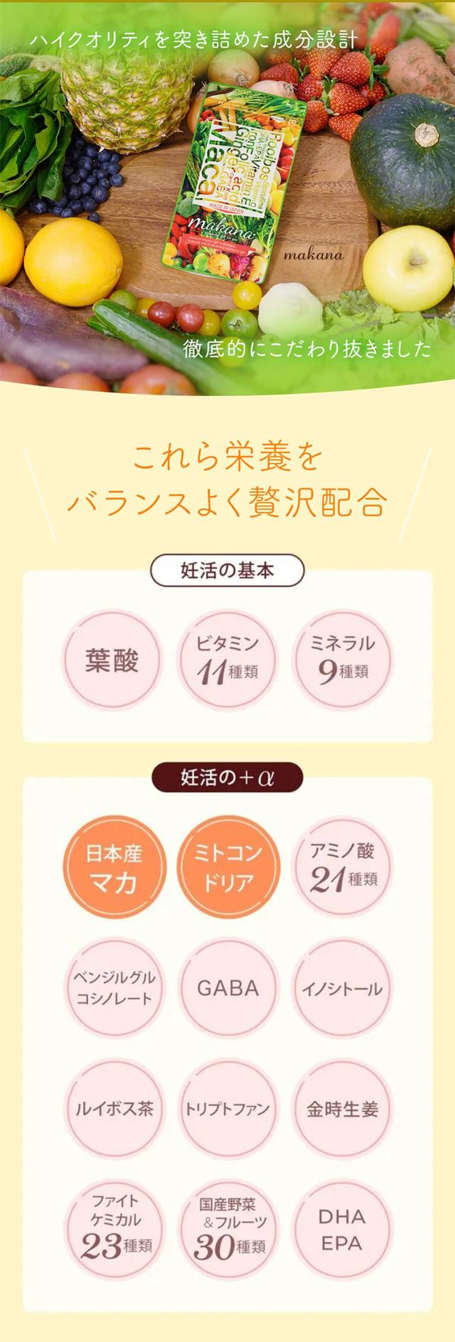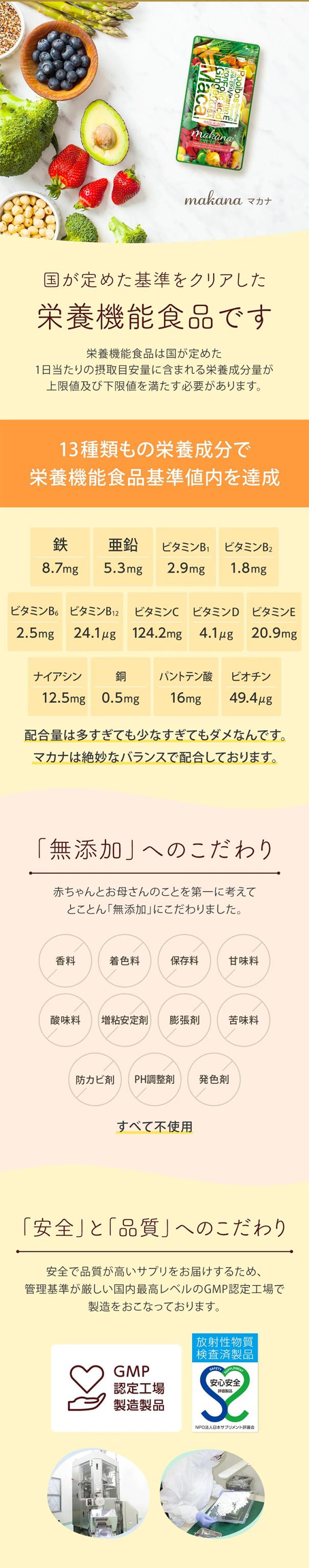 - 無添加、国産マカ等、安心できる要素が多いのがうれしいです。葉酸だけではなく他にもたくさんの栄養を手軽にとれることに感謝です。