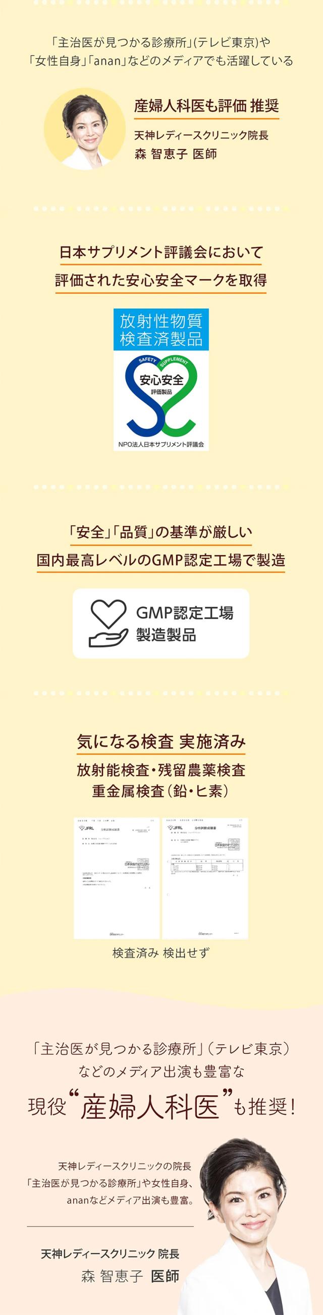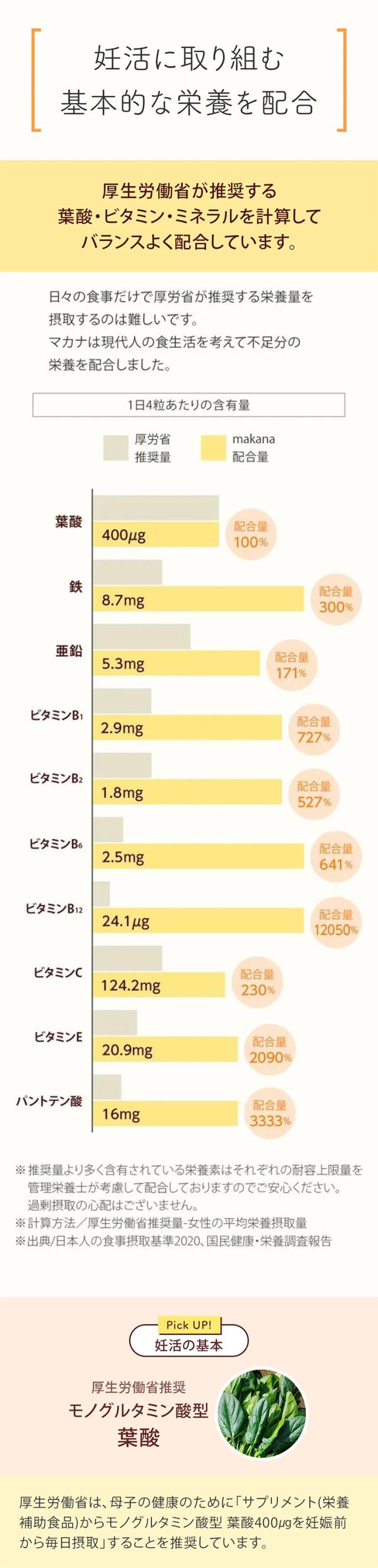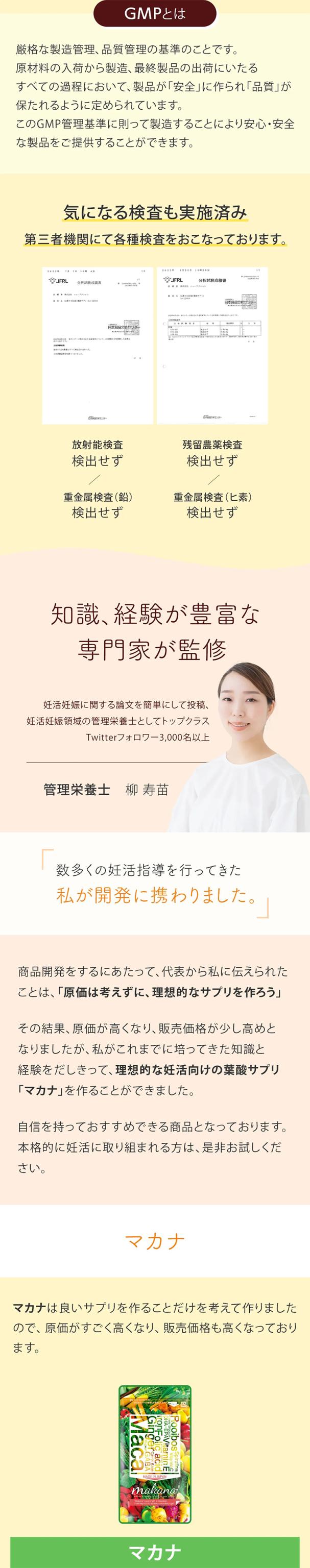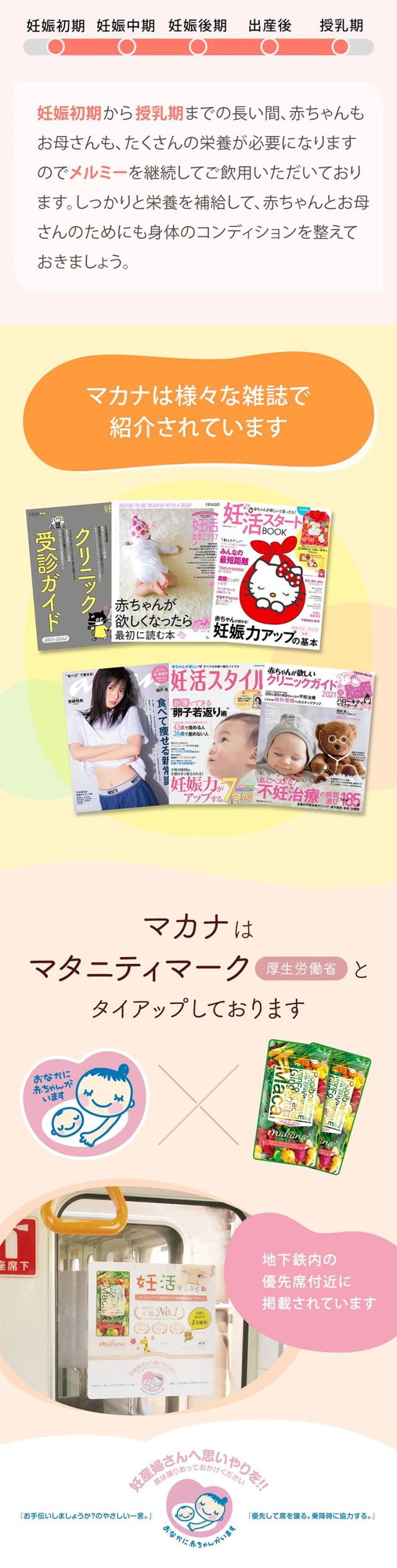 - 無添加、国産マカ等、安心できる要素が多いのがうれしいです。葉酸だけではなく他にもたくさんの栄養を手軽にとれることに感謝です。