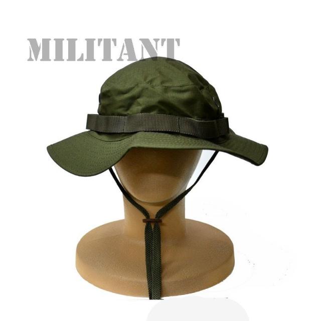 ミリタリーカラーの定番のカラーOD色のブーニーハットです。RANGER−ハット・ブッシュハットやアメリカンハットなど、色々な通称があります。帽体の周りのベルトには木の枝や草を偽装の為に挟む穴があり、環境によりそこに生えている植生を偽装に利用できますのでブッシュに入ったとき等偽装効果がアップします。ツバが360°にありますので夏の炎天下などのアウトドアやトレッキングにお勧めです。総火演・航空祭等では、必須アイテムです。サイズ展開はL(59cm)・LL(61cm)の2サイズです。※この商品はネコポス対応商品です。※代金引換のお客様はネコポスを御利用頂けませんので通常送料となります。