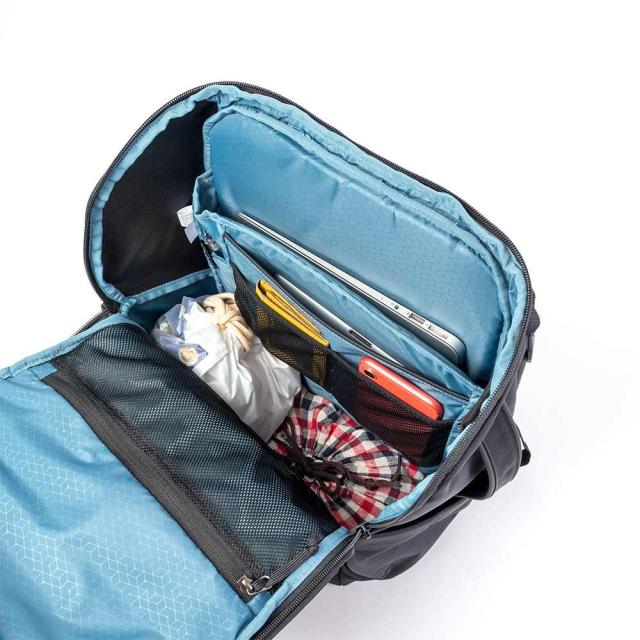 大きく開くU字型の開口で、荷造りや荷解きが簡単にできる、頑丈でエコフレンドリーなトラベルバックパックです。