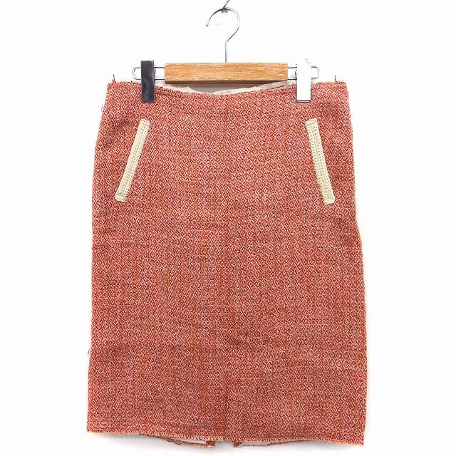 【中古】マカフィー MACPHEE トゥモローランド 台形 スカート 膝丈 ニット 総柄 フリンジ 切替 36 レッド 赤 ピンク