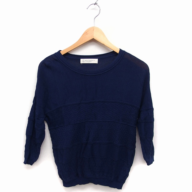 【中古】B&Y ユナイテッドアローズ BEAUTY&YOUTH ビューティー&ユース ニット セーター 丸首 七分袖 柄編み コットン