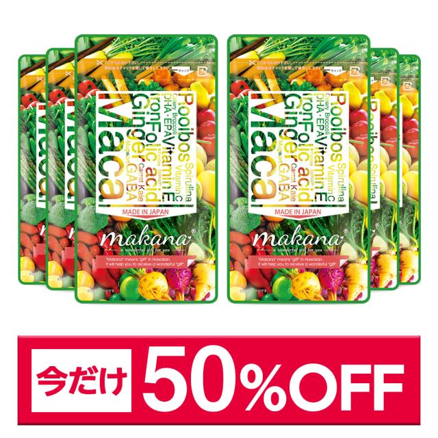 | 原材料 | マカ(国産)、亜鉛含有酵母、ナイアシンアミド含有酵母、野菜粉末(大麦若葉、ケール、さつまいも(アヤムラサキ)、ほうれん草、南瓜、人参、桑の葉、大葉)、V.E含有植物油、金時ショウガ、V.B₆含有酵母、ルイボス茶エキス、マグネシウム含有酵母、フルーツ野菜エキス(ぶどう種子、茶葉、ぶどう果皮、マルトデキストリン、トマト、人参、ビルベリー、ブロッコリー、キャベツ、玉ねぎ、にんにく、グレープフルーツ、アスパラガス、パパイヤ、パイナップル、いちご、りんご、アプリコット、さくらんぼ、オレンジ、ブラックカラント、オリーブ、きゅうり)、スピルリナ、α-リポ酸、DHA含有精製魚油粉末(乳成分を含む)、GABA、還元型コエンザイムQ10/セルロース、貝Ca、V.C、HPC、ステアリン酸Ca、酸化ケイ素、ピロリン酸鉄、パントテン酸Ca、ヘム鉄、セラック、グルコン酸銅、V.B₁、V.B₂、葉酸、塩化K、イノシトール、L-トリプトファン、ビオチン、V.B₁₂、V.D |