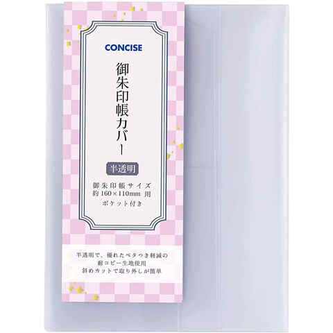 ストア内の商品は全品送料無料です。御朱印サイズのブックカバーです。ポケット付きなので、便利!【カラー】半透明【本体サイズ(約)】縦17×横34.5cm【対応サイズ(約)】[御朱印帳]縦16×横11cm【素材】塩化ビニル樹脂■メーカー: コンサイス