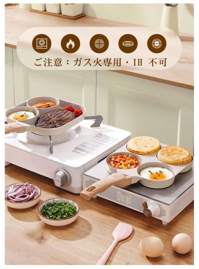 | 様々な調理を同時進行でき時短になるので、忙しい朝にお弁当や朝食作りにとても便利です。 円形仕切りにより、目玉焼き、ソーセージ、パンケーキ、今川焼きなどを綺麗に仕上げます。 鍋の内面は焦げ付き防止コーティングで処理されているため、全体を水洗いでき長期間清潔に使い続けられます。_x000b_調理後もスポンジで軽く拭くだけで、汚れもスルッと落ちます。 オシャレなデザインにより、キッチンを明るく、日々のお調理がより一層楽しくなります。 ご注意:ガス火専用・IH 不可 | |