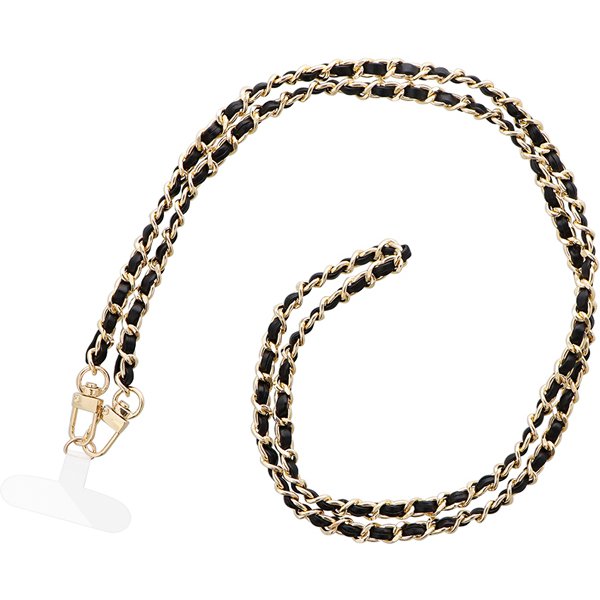 説明:端末やケースを選ばず装着できる多機能ショルダーストラップ/付属の挟み込みシートで、ケースにストラップホールが無くても装着可能/首や肩の負担になりにくい軽量チェーンを使用/レザーを編み込んだ大人なデザイン■検索ワード■