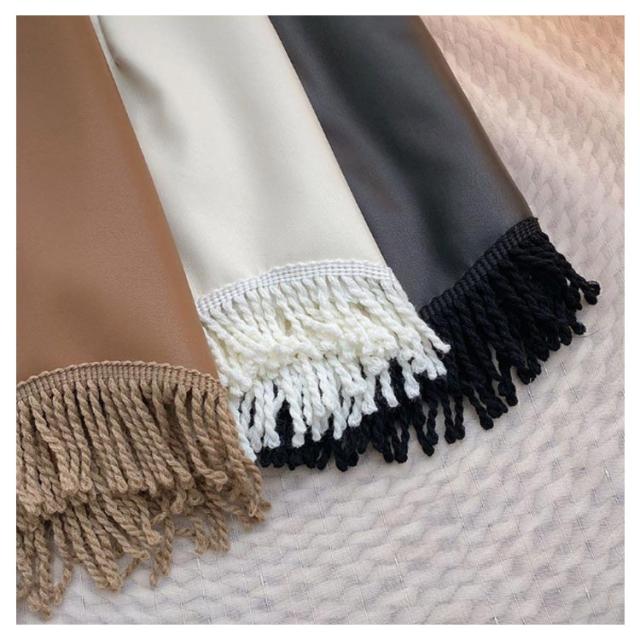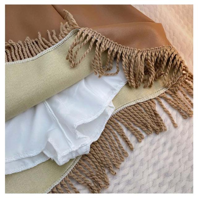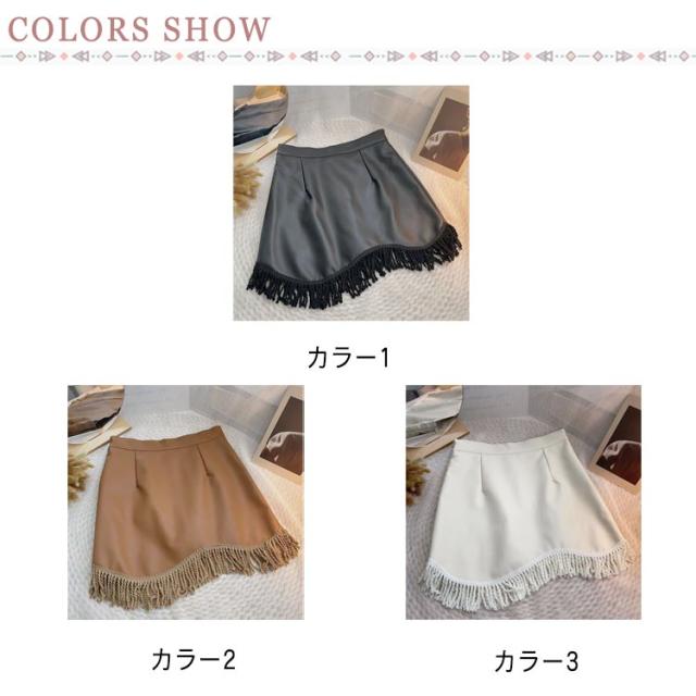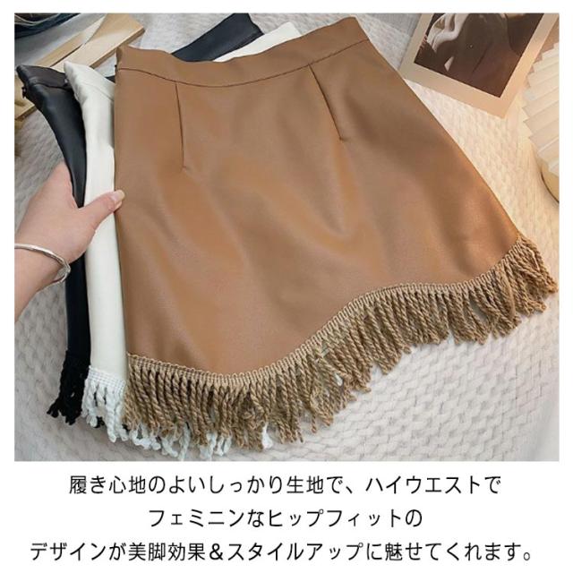 | フリンジ付き、PUレザーを使用しているためミニスカートです。 長時間履いてもシルエットが崩れにくく、機能性も十分のスカートです。 履き心地のよいしっかり生地で、ハイウエストでフェミニンなヒップフィットのデザインが美脚効果&スタイルアップに魅せてくれます。 | |